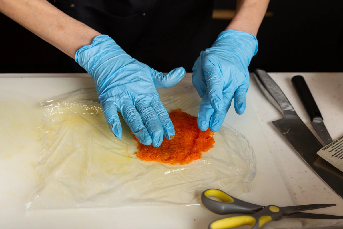 Распределите тонкий слой варёной моркови по пищевой плёнке.