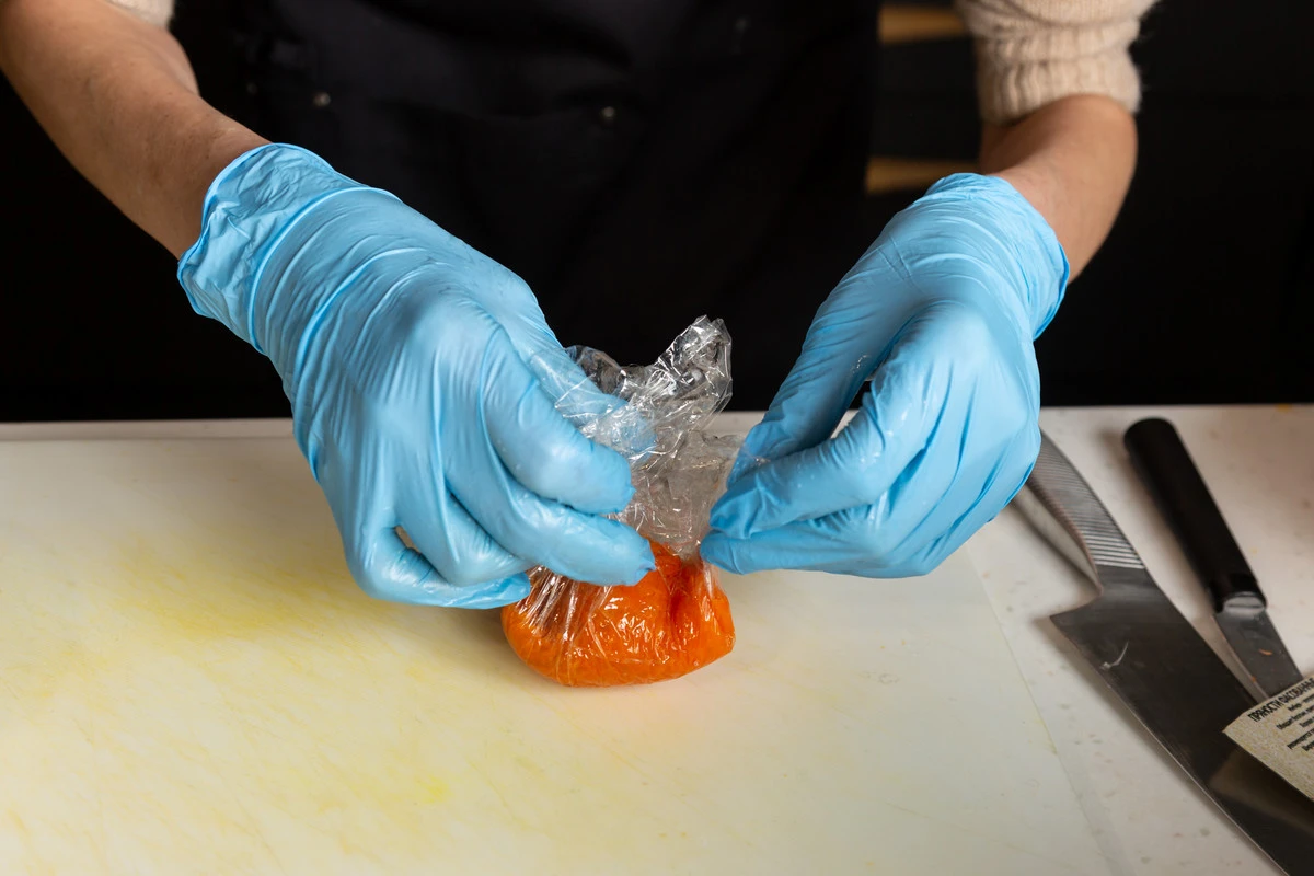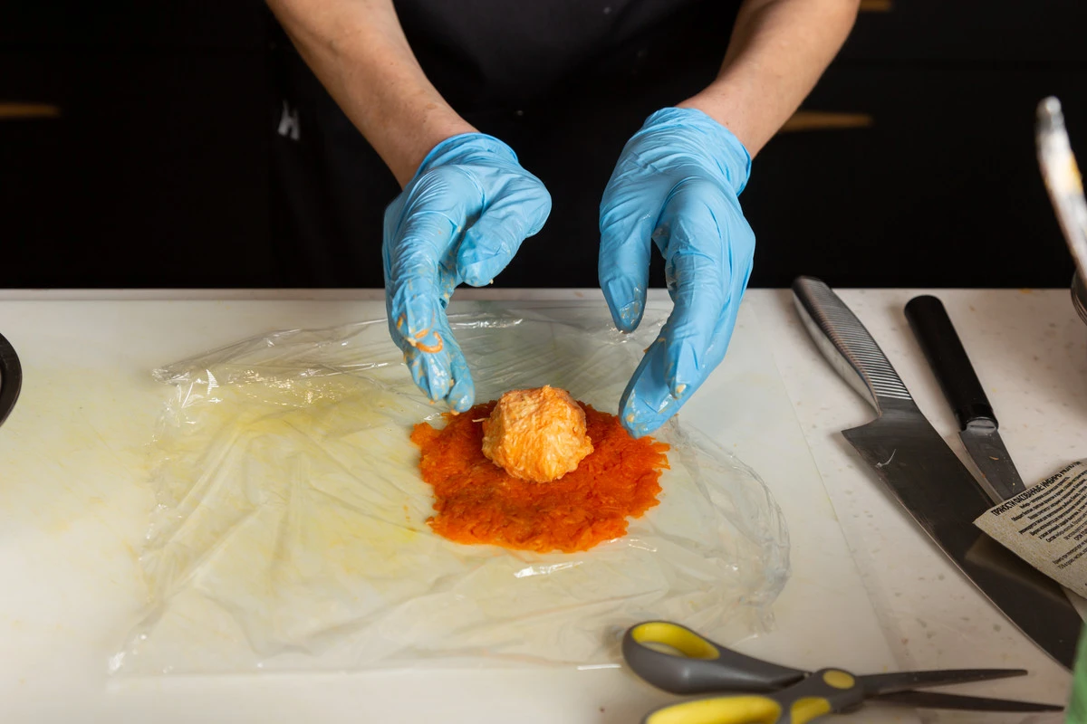 Сделайте «кожуру». Для этого оберните каждый шарик плёнкой с морковью, плотно прижимая её к поверхности «мандарина». Аккуратно снимите плёнку.