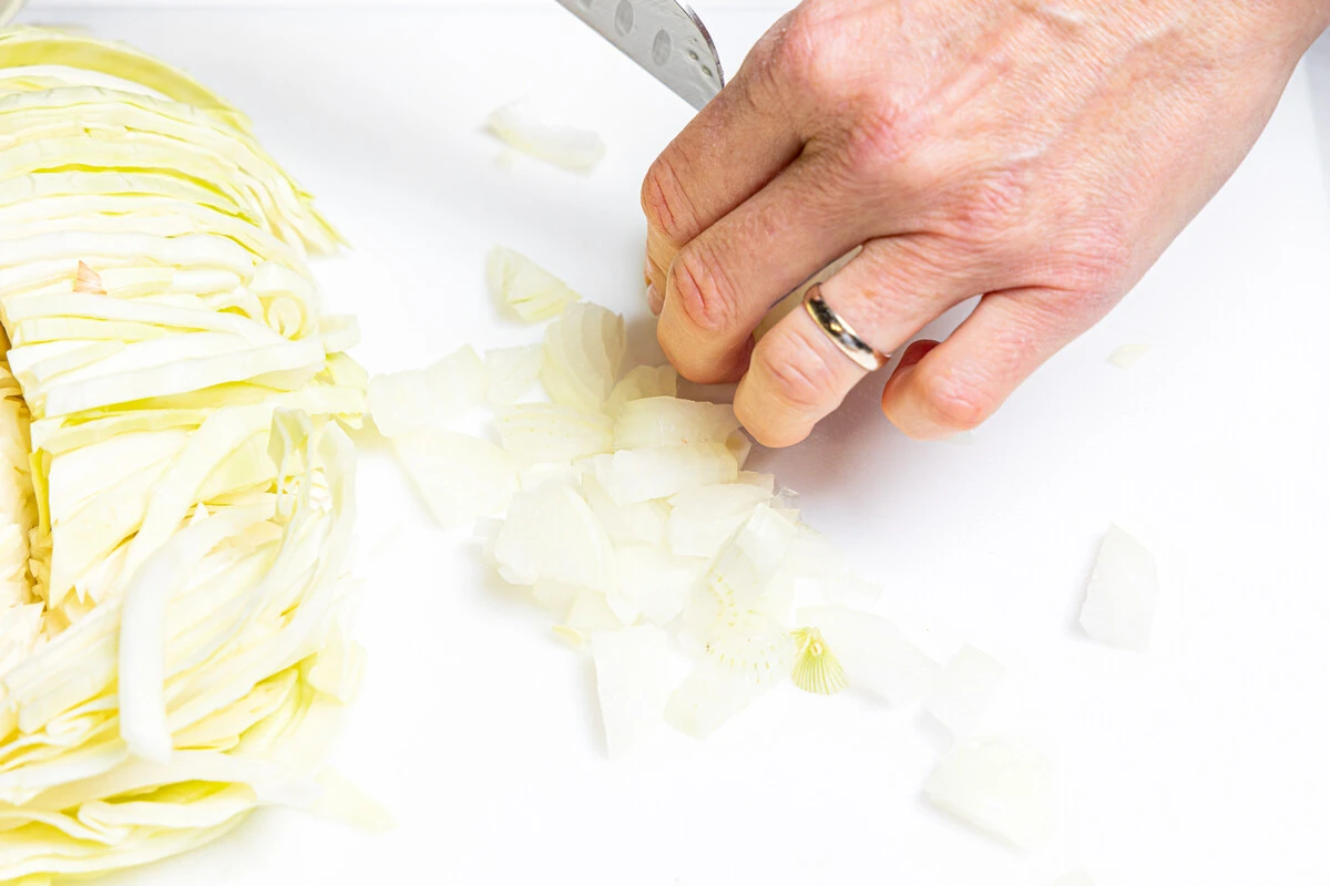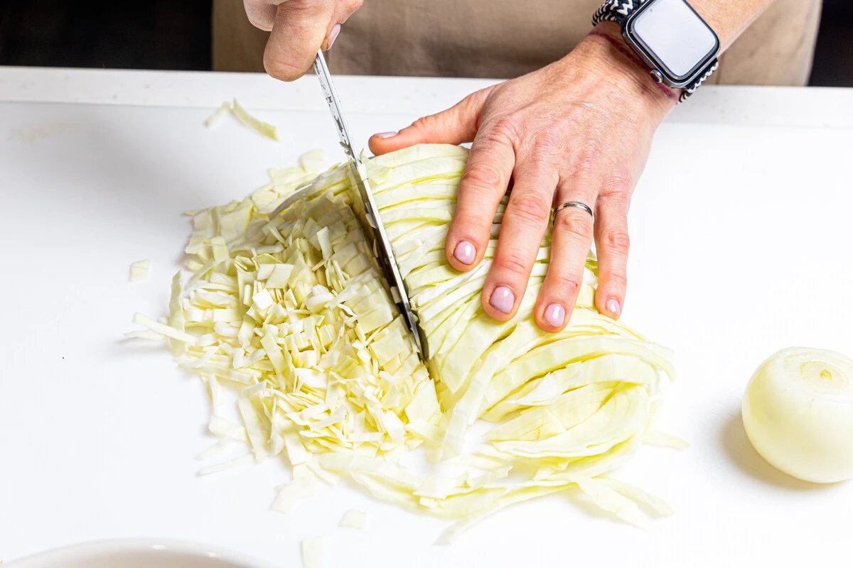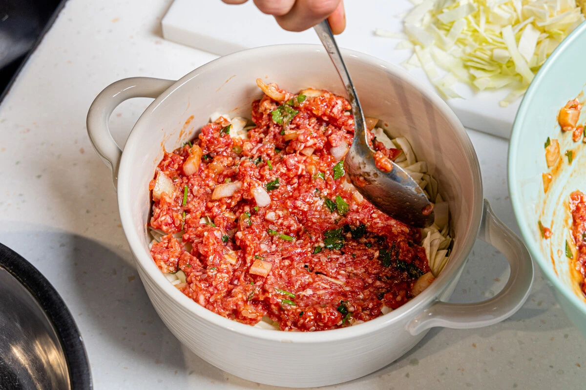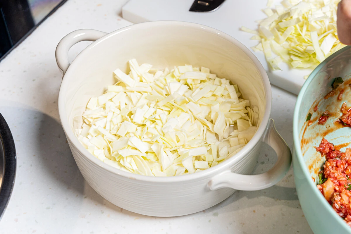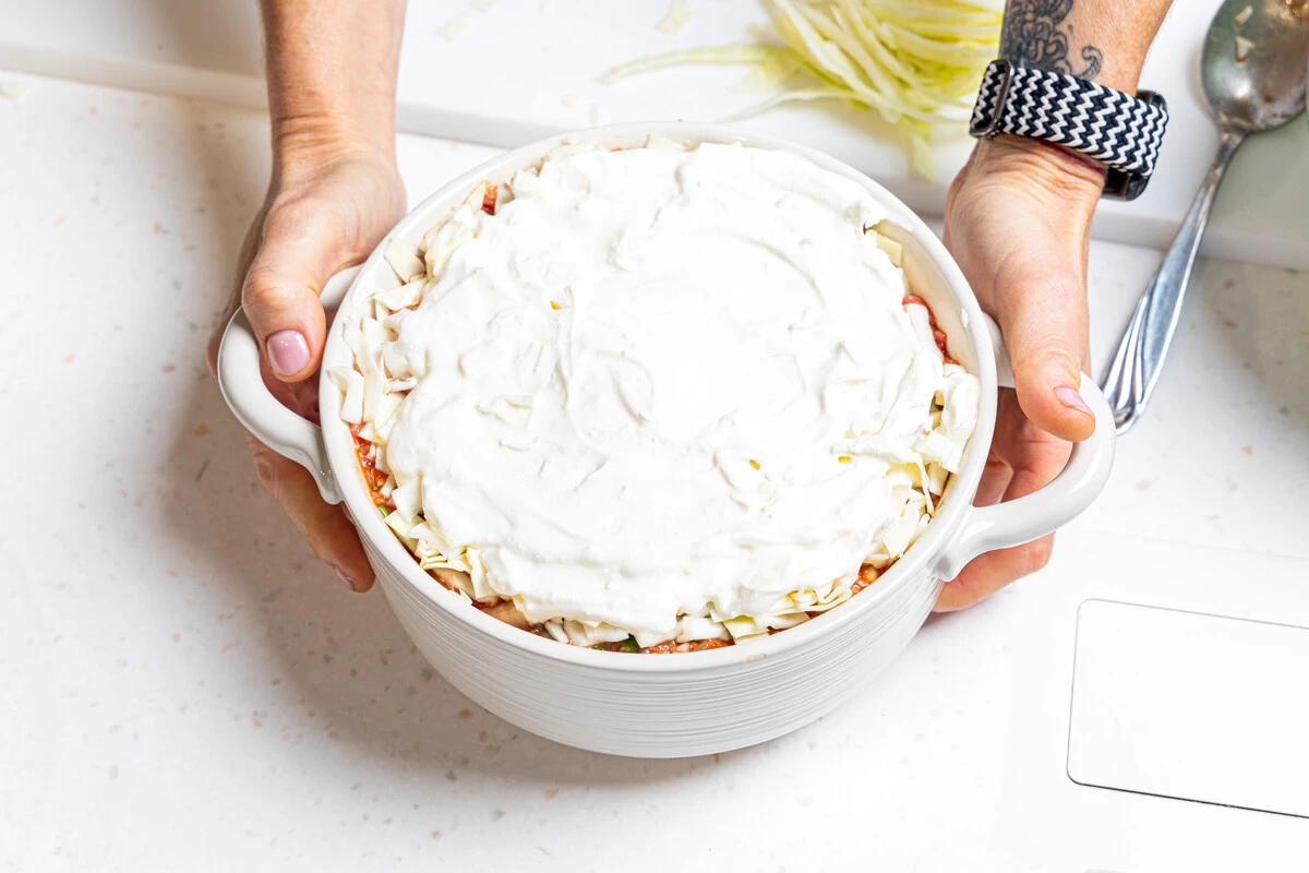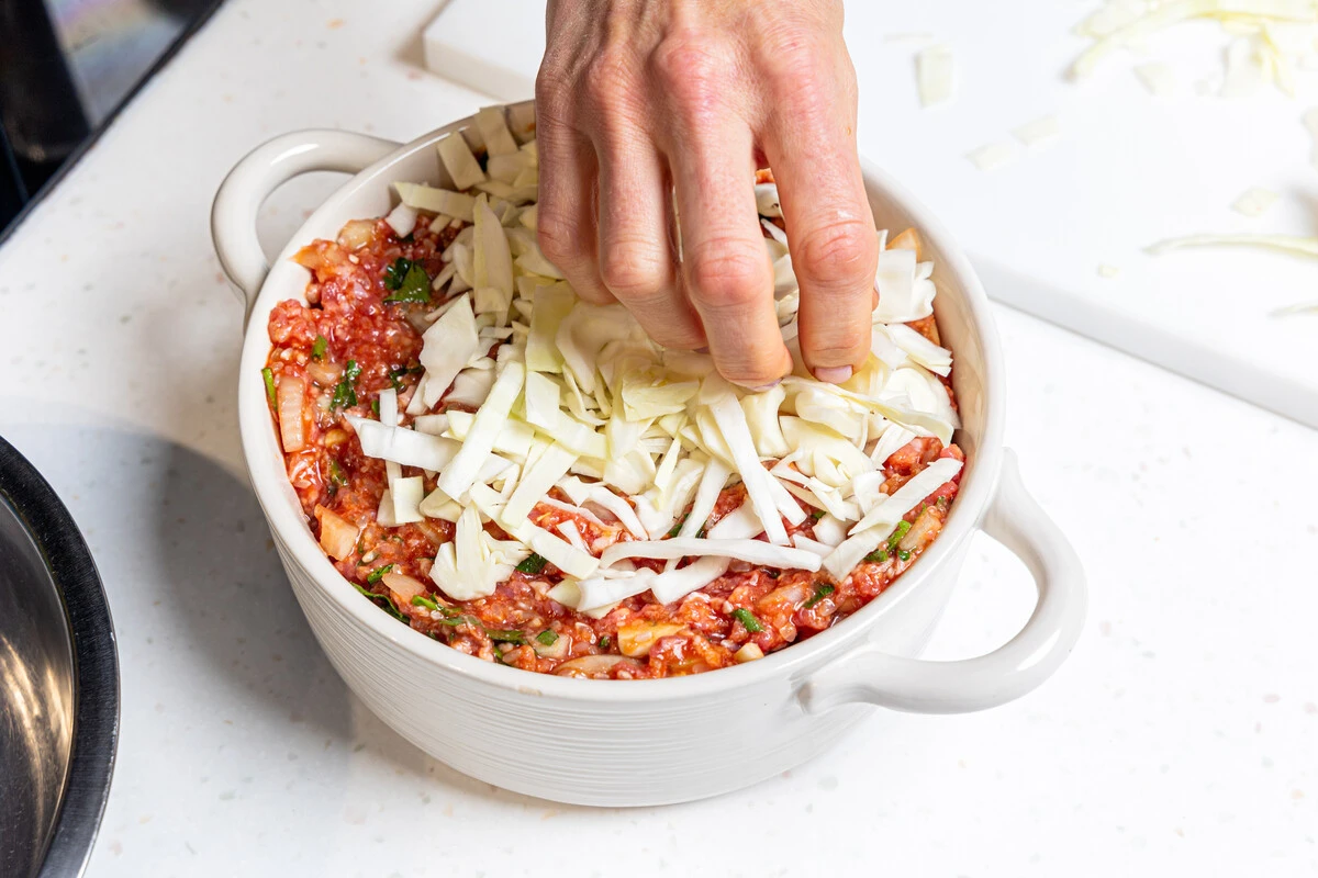 Затем ещё слой капусты и утрамбуйте. Сверху распределите оставшийся фарш, а после капусту.