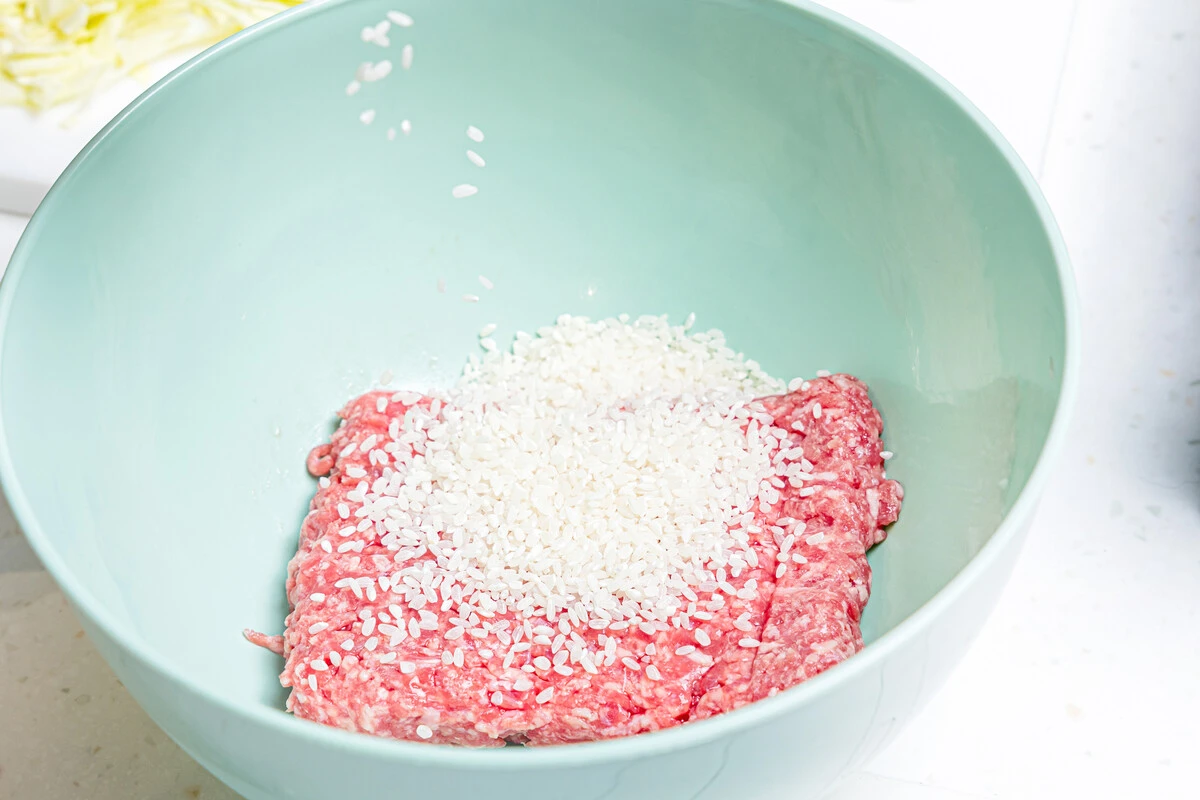 Выложите фарш в миску, добавьте рис, лук и чеснок.