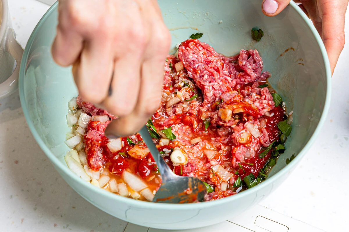 Петрушку измельчите. Добавьте к фаршу зелень, томатную пасту, сахар, соль и налейте стакан холодной воды. Перемешайте до однородности.