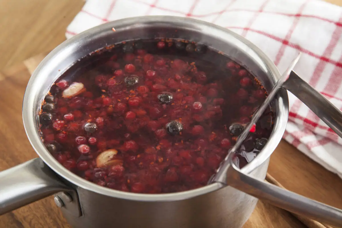 В одном литре воды вскипятите все специи, затем выключите огонь и всыпьте промытую клюкву, дайте остыть до комфортной температуры, раздавите ягоду толкушкой для пюре.