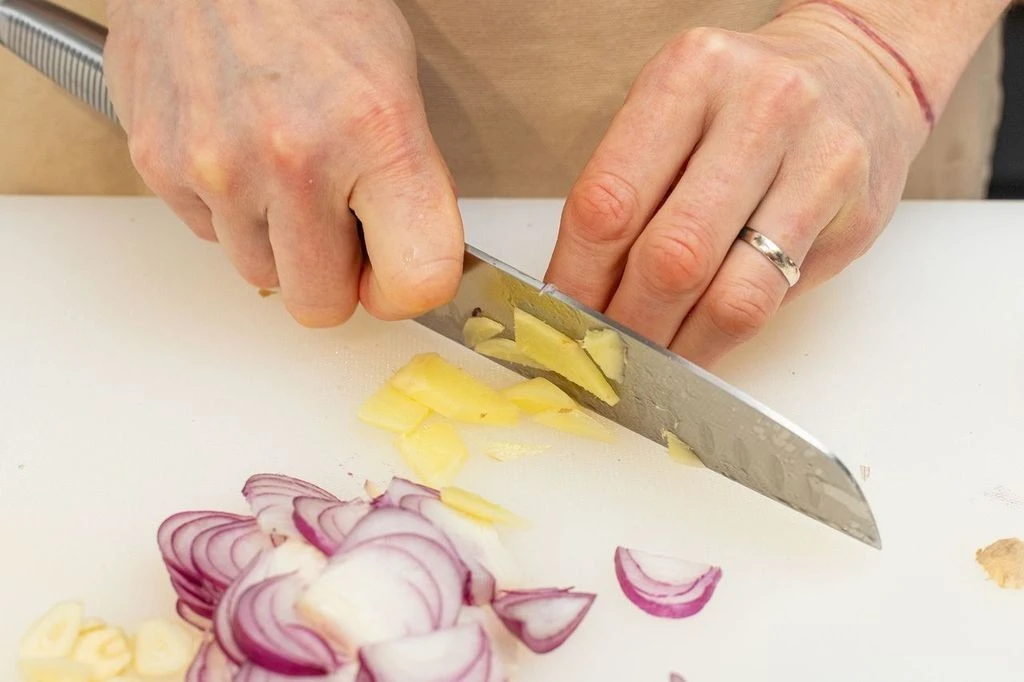 Почистите чеснок, лук и корень имбиря. Нарежьте чеснок мелко, лук — перьями, имбирь — соломкой.