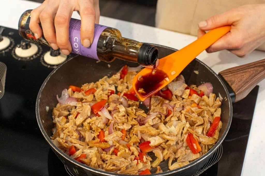 Болгарский перец очистите от семян и нарежьте кубиками. Добавьте к белку с овощами, перемешайте и готовьте всё вместе ещё 5–7 минут. За пару минут до приготовления добавьте соус терияки. По желанию добавьте для вкуса немного нарезанного перца чили.