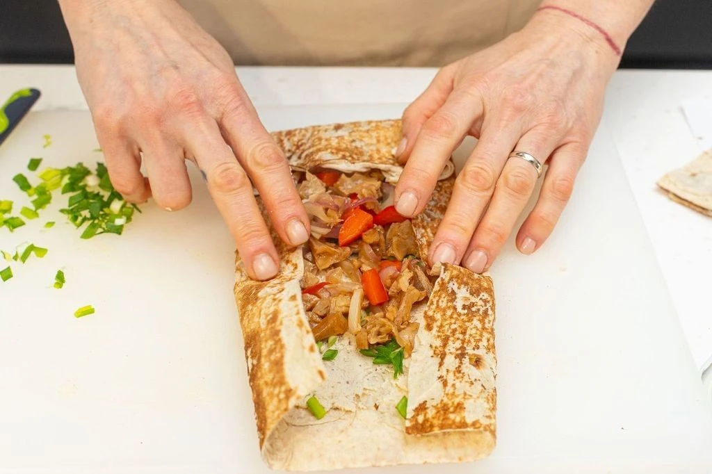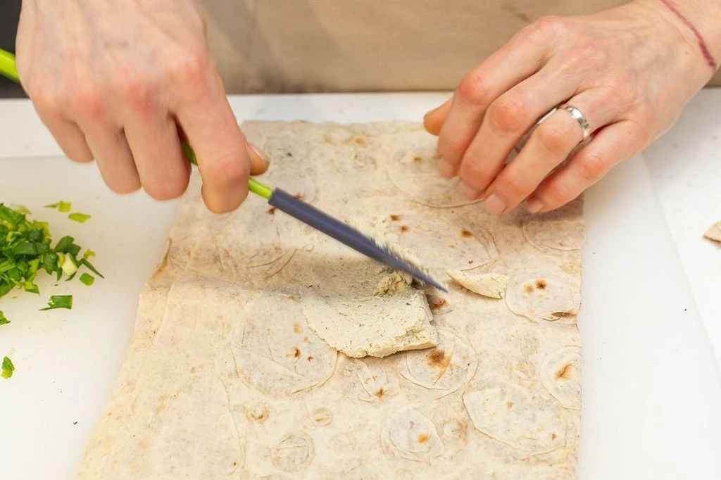 Зелёный лук мелко нарежьте. Каждый лаваш смажьте примерно 1 ст. ложкой пасты тофу, посыпьте зелёным луком, выложите растительный белок с овощами.