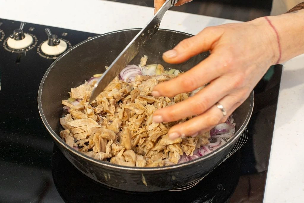 Разогрейте сковороду с 2 ст. ложками растительного масла и выложите на неё чеснок, лук, имбирь, перемешайте и готовьте примерно 5 минут. Добавьте растительный белок, обжаривайте ещё примерно 2 минуты.