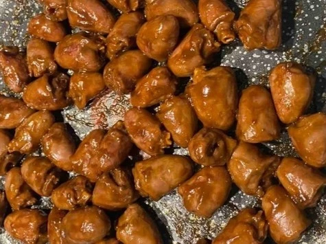 Прогрейте сковороду с кунжутным маслом. Выложите на сковороду сердечки, добавьте немного маринада, затем тушите сердечки под крышкой в течение 10 минут.