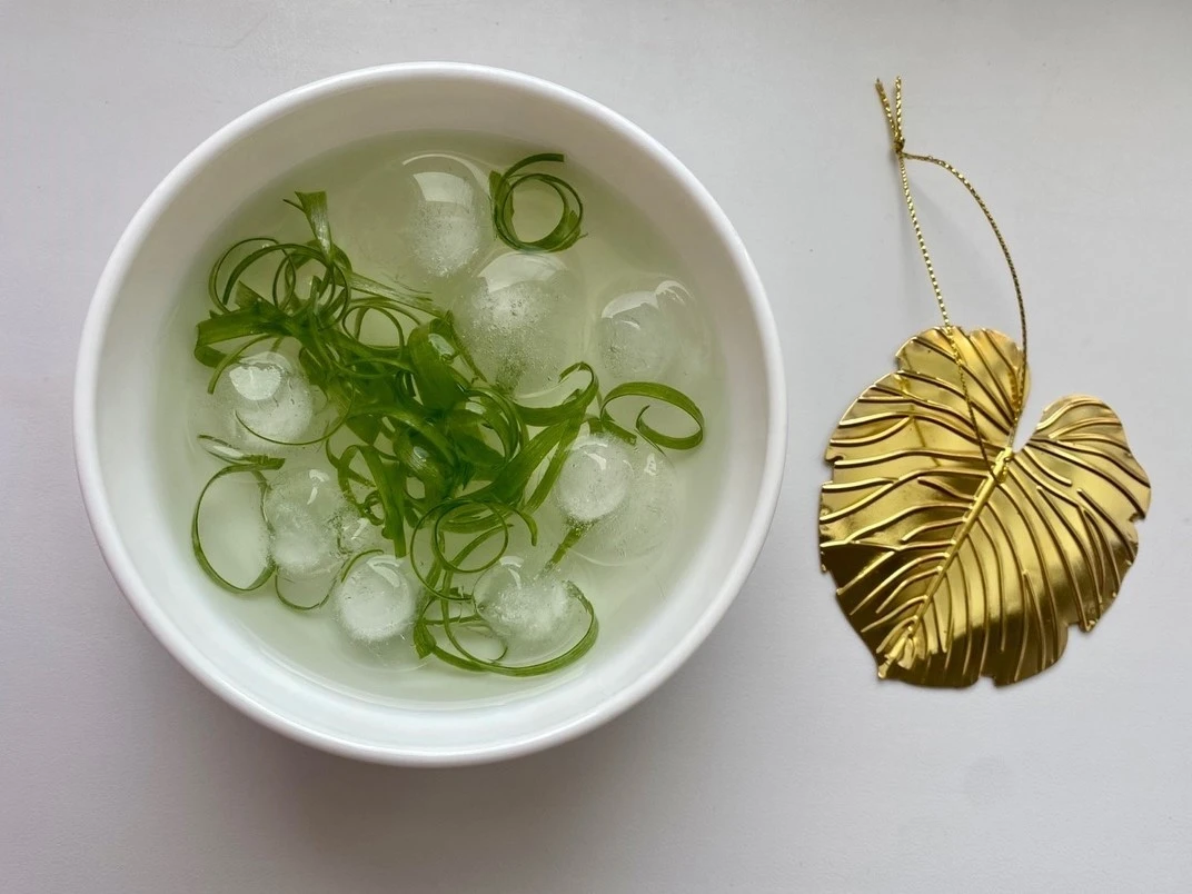 Полезное дополнение, как приготовить «кучерявый лук». Нарежьте зелёный лук по 7–8 сантиметров. Каждое перо лука разрежьте вдоль на 6 частей. Положите полоски лука в холодную воду со льдом.
