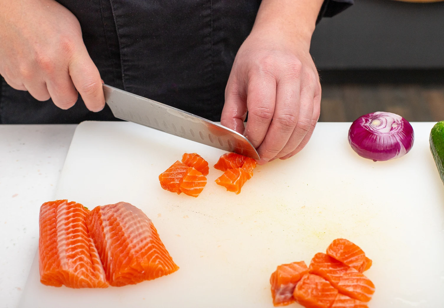 Нарежьте форель кубиками, редис — тонкими слайсами.