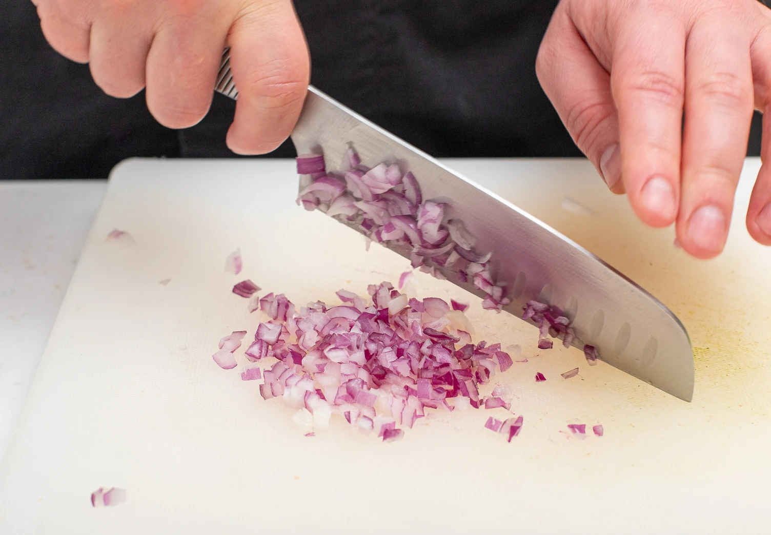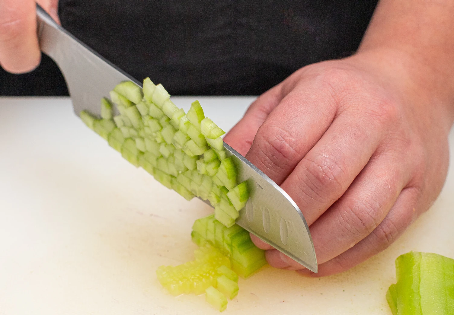 Огурец очистите от кожуры и нарежьте мелкими кубиками.
