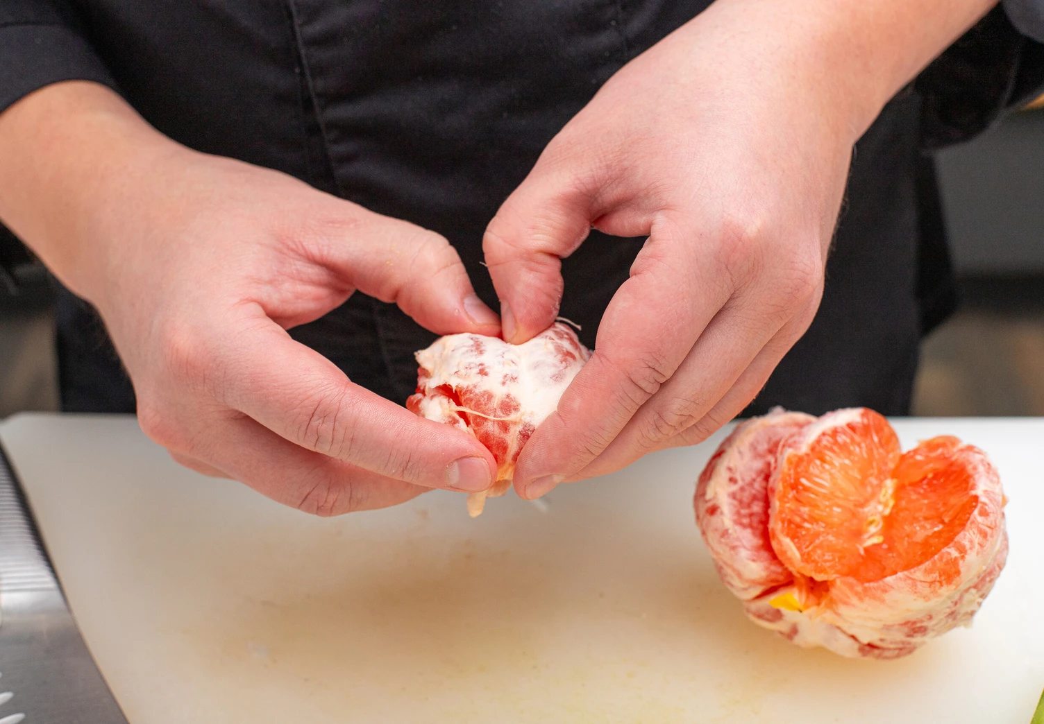 Очистите грейпфрут от белой плёнки и нарежьте мякоть на небольшие сегменты. Кумкват нарежьте тонкими кружочками.