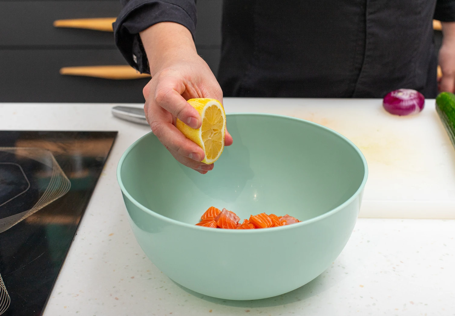 Смешайте форель с солью, чёрным перцем и соком лимона, оставьте мариноваться на 5–8 минут.