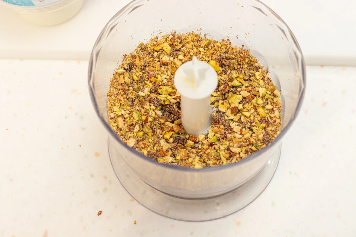 Насыпьте в чашу блендера орехи и клюкву и измельчите так, чтобы остались маленькие кусочки.