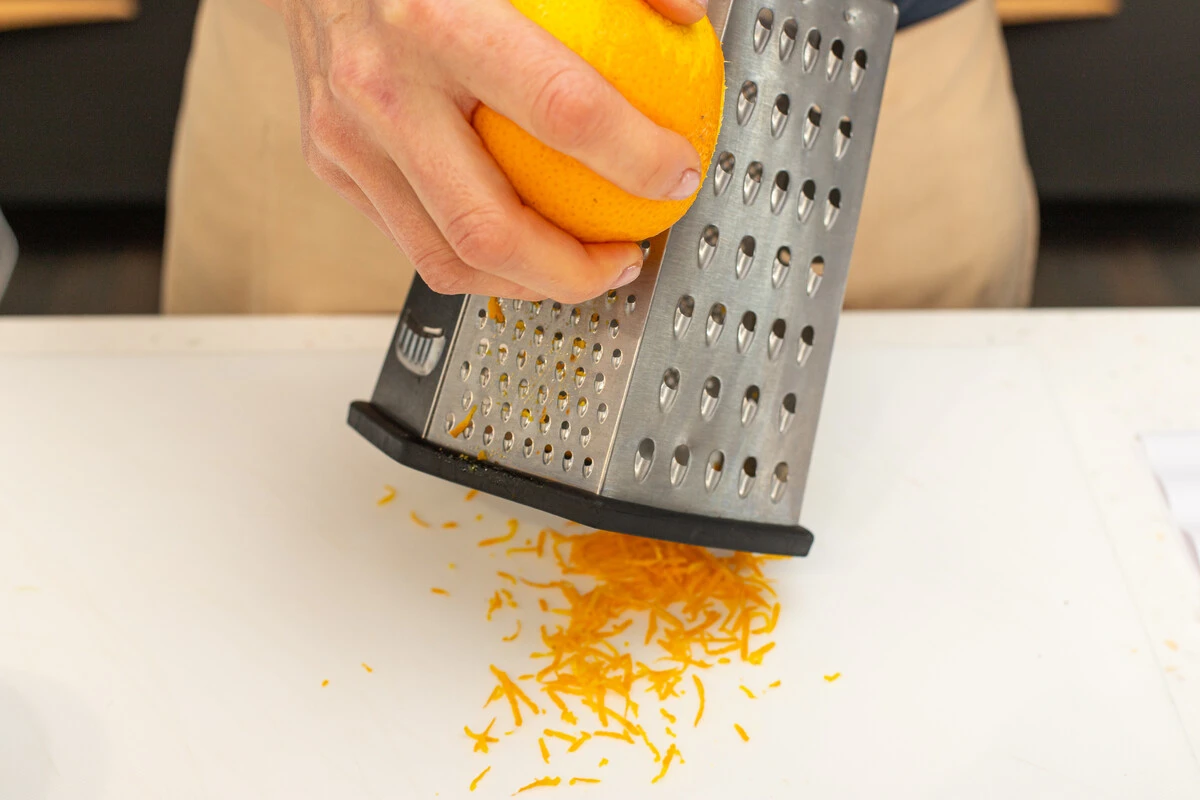 С апельсина аккуратно снимите треть цедры, не затрагивая белый слой. Добавьте её в молотые орехи с клюквой, перемешайте.