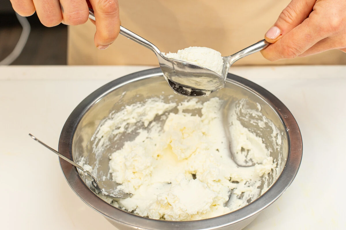 В миске смешайте козий сыр и творог. Сформируйте шарики диаметром примерно 4-5 см. Сделать это можно руками или с помощью двух ложек.