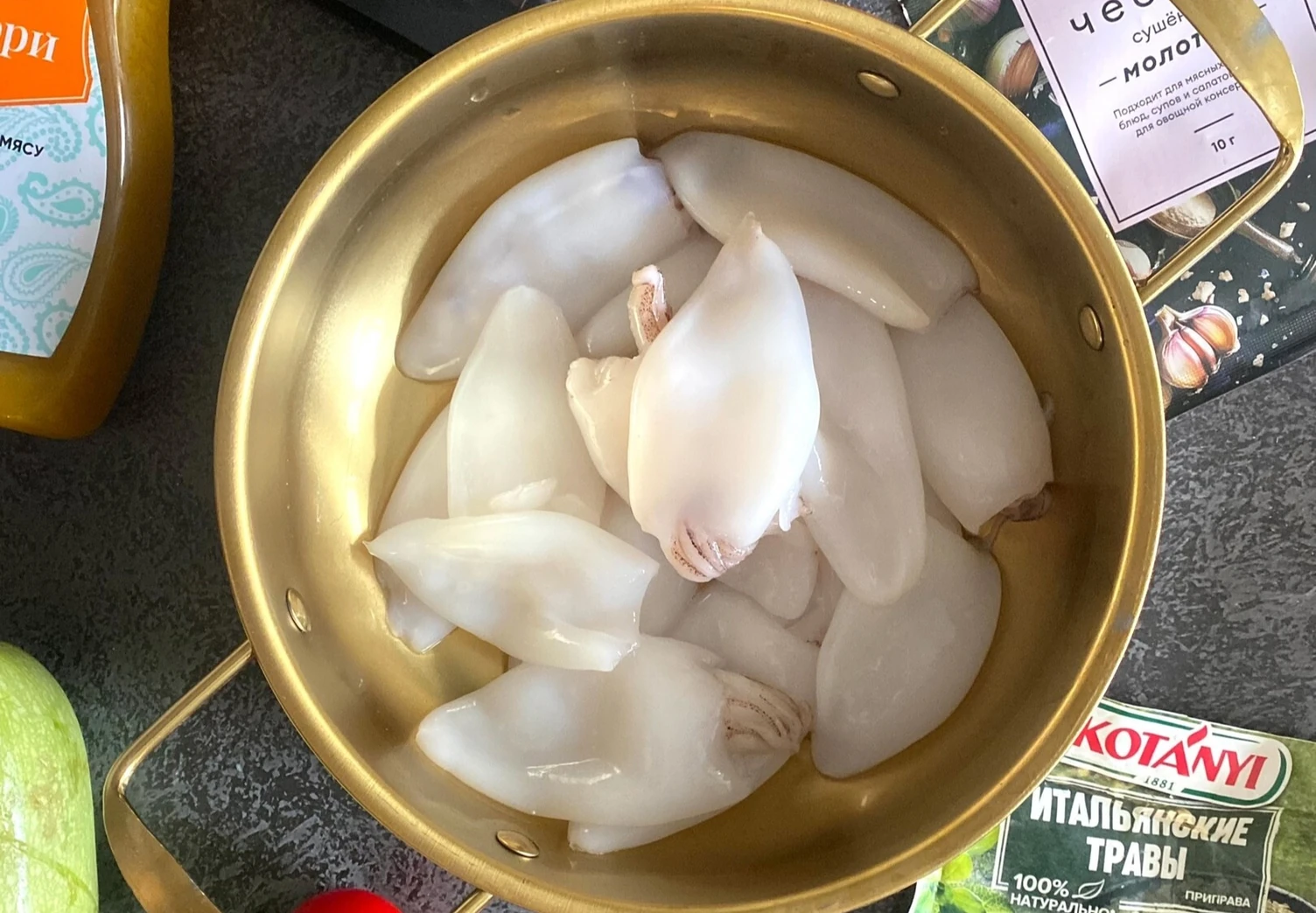 Для маринада смешайте все необходимые ингредиенты, кроме масла. Замаринуйте кальмар и овощи, дайте настояться.