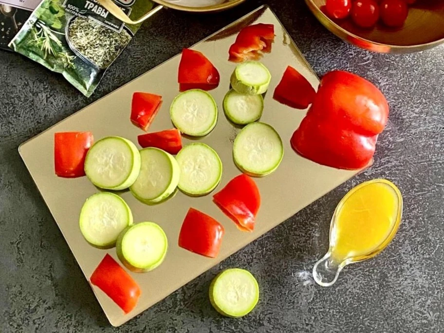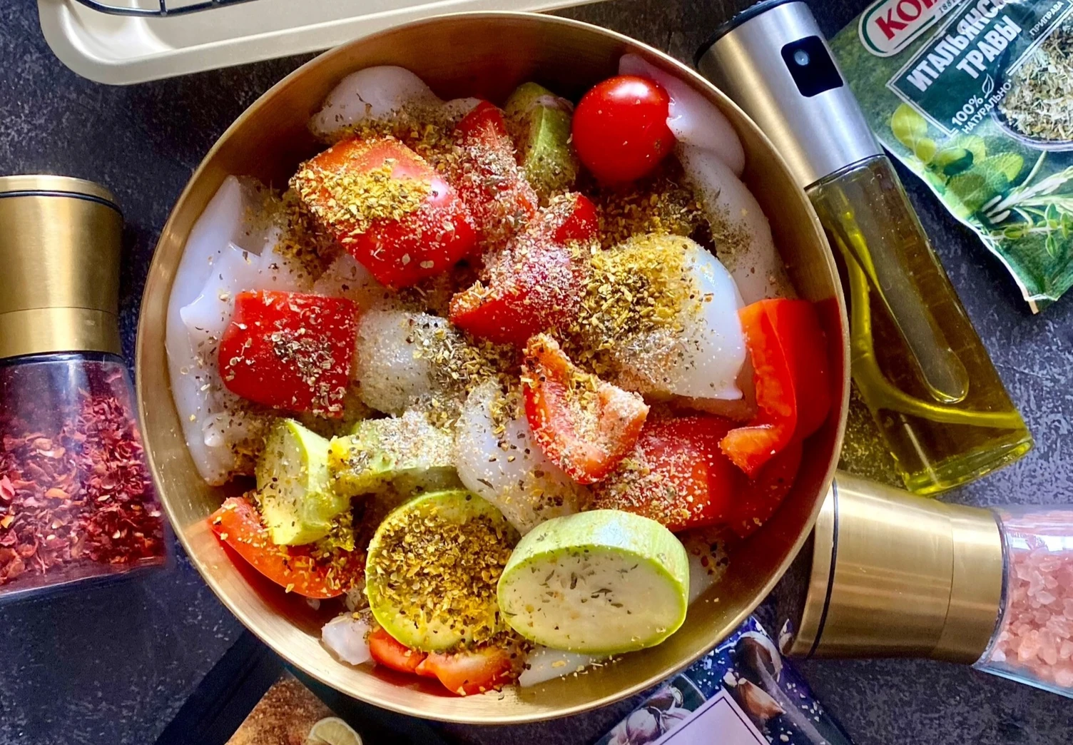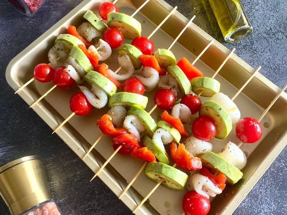 Насадите на шпажки кальмара и овощи, сбрызните оливковым маслом.