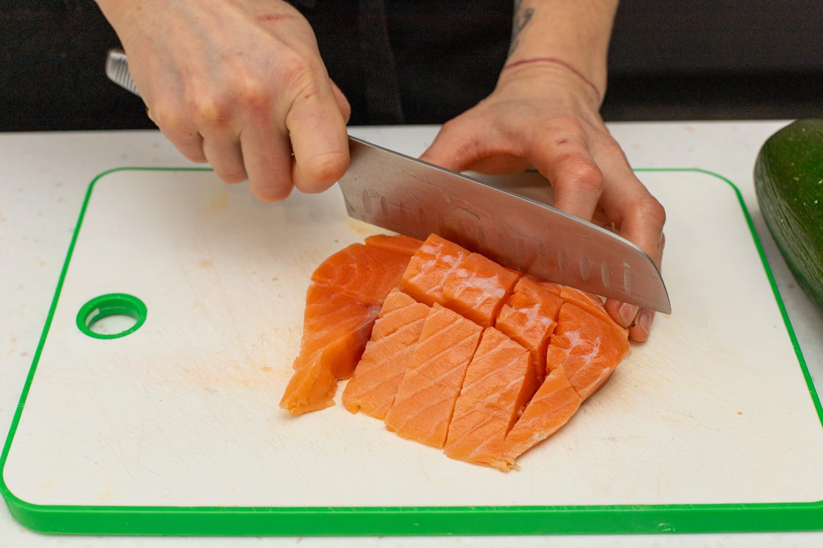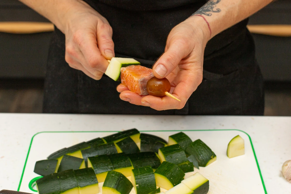 Цукини нарежьте кубиками примерно такого же размера, что и рыба. На шпажки нанижите кусочки рыбы, перемежая с цукини и целыми черри.