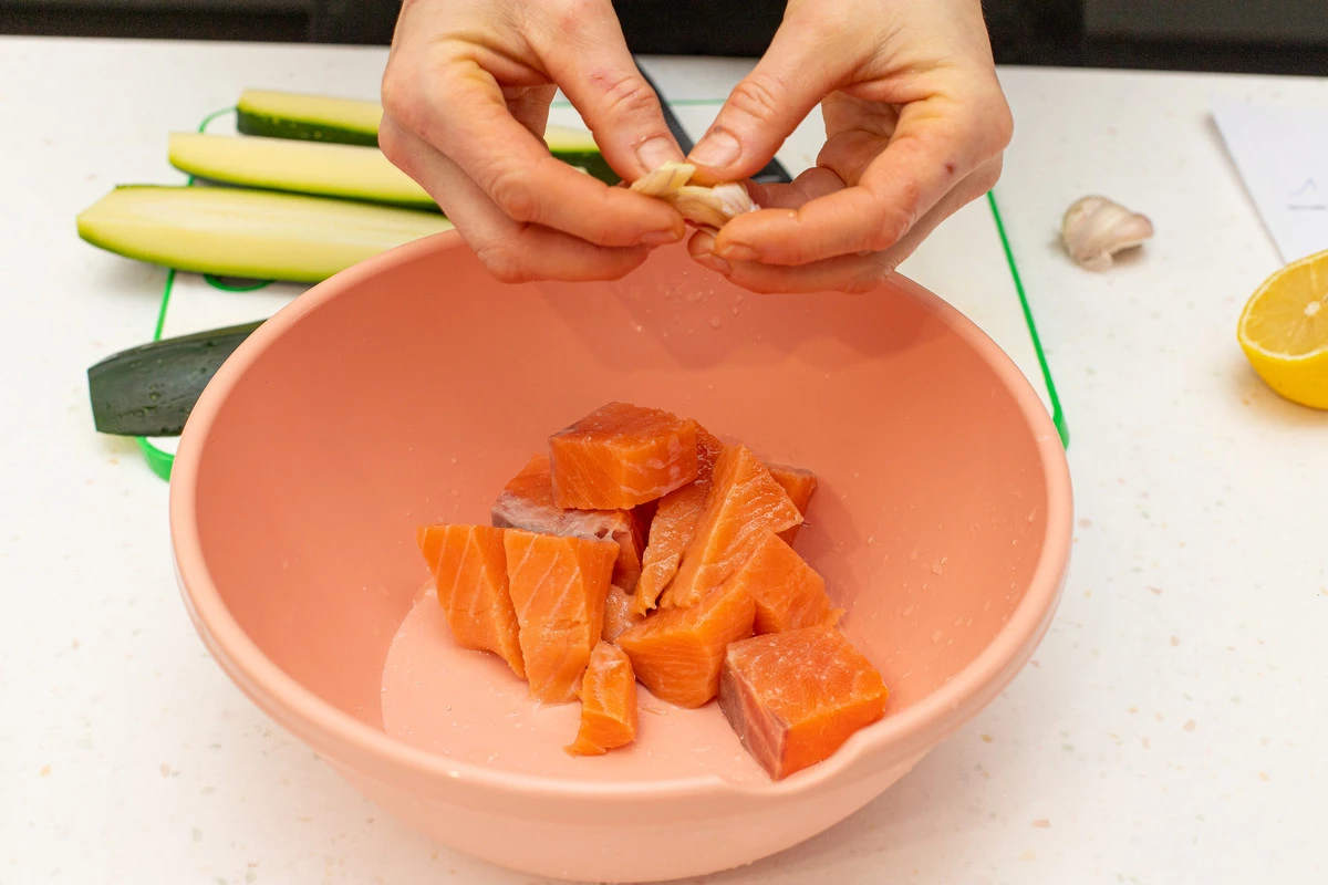 Сложите в контейнер или миску, посолите, добавьте цедру лимона (только жёлтую часть) и щепотку кориандра, полейте соком половинки лимона. Добавьте раздавленные зубчики чеснока и оливковое масло, всё перемешайте и оставьте мариноваться на 15 минут.