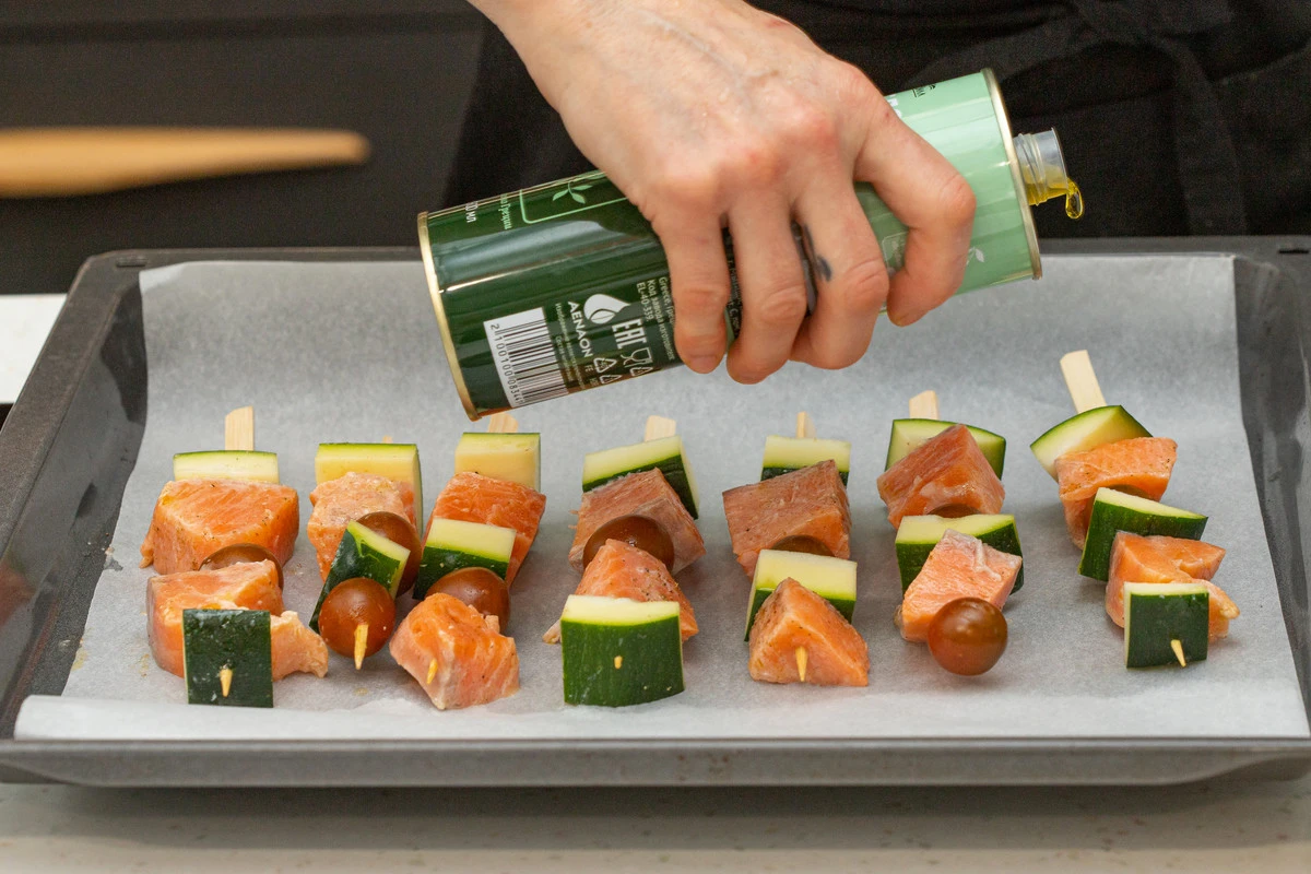 Выложите шпажки на противень, застеленный пергаментом. Сбрызните оливковым маслом.