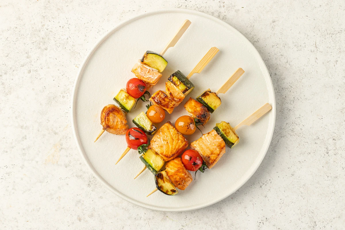 Разогрейте духовку до 210 °C и запекайте шашлычки из сёмги 10-12 минут. Подавайте горячими.