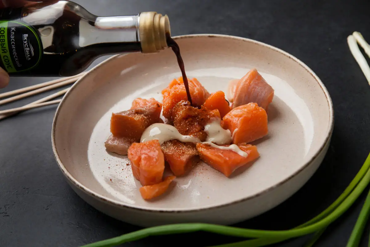 Шпажки замочите в воде. Для маринада смешайте медово-горчичный соус, соевый соус, оливковое масло и чили. Выдавите чеснок. Перемешайте маринад. Нарежьте сёмгу кубиками размером 3х3 см и замаринуйте примерно на час при комнатной температуре.