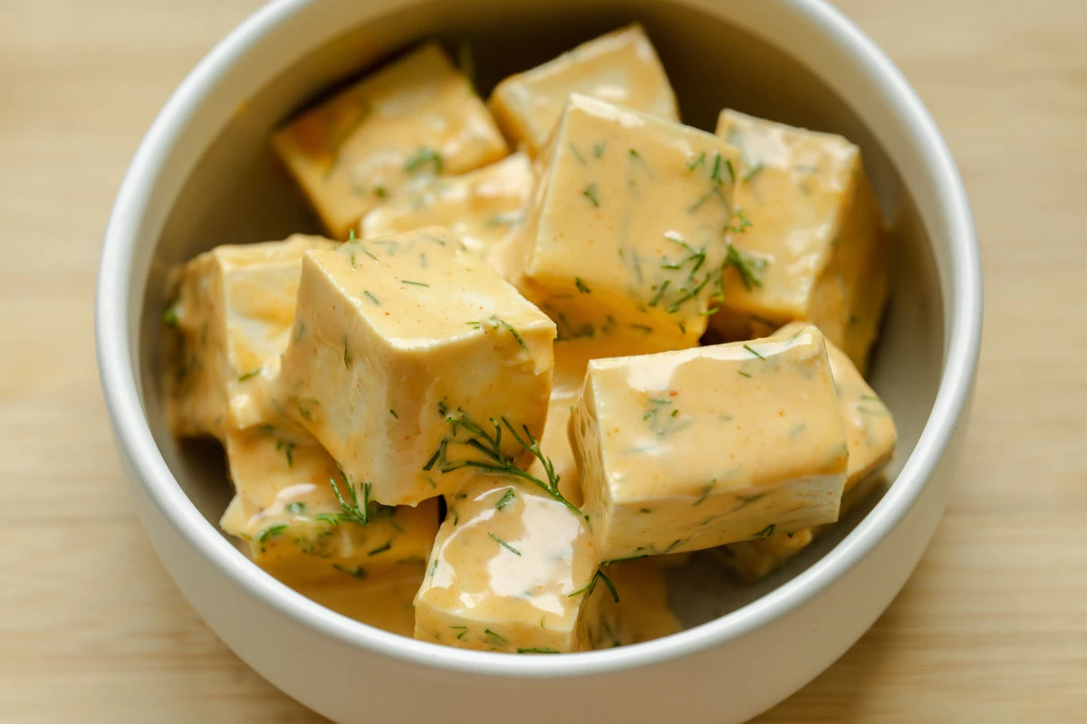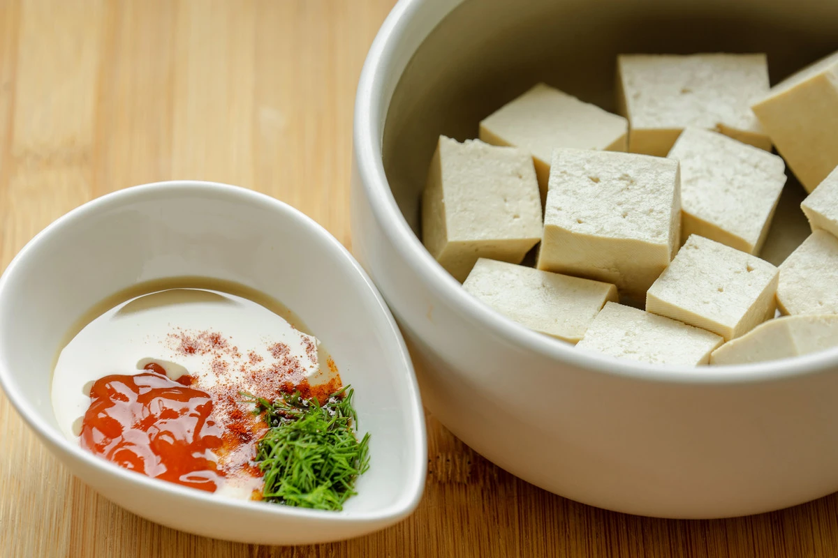Соедините арахисовую пасту, соусы шашлычный и соевый, паприку, мелко нарезанную веточку укропа. Перемешайте с тофу и оставьте на 30 минут.