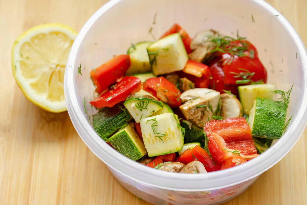 Овощи нарежьте кубиками того же размера, что и тофу. Смешайте все овощи в миске, добавьте сок половины лимона, оливковое масло, соль, чёрный перец, вторую измельчённую веточку укропа. Оставьте мариноваться на 30 минут.