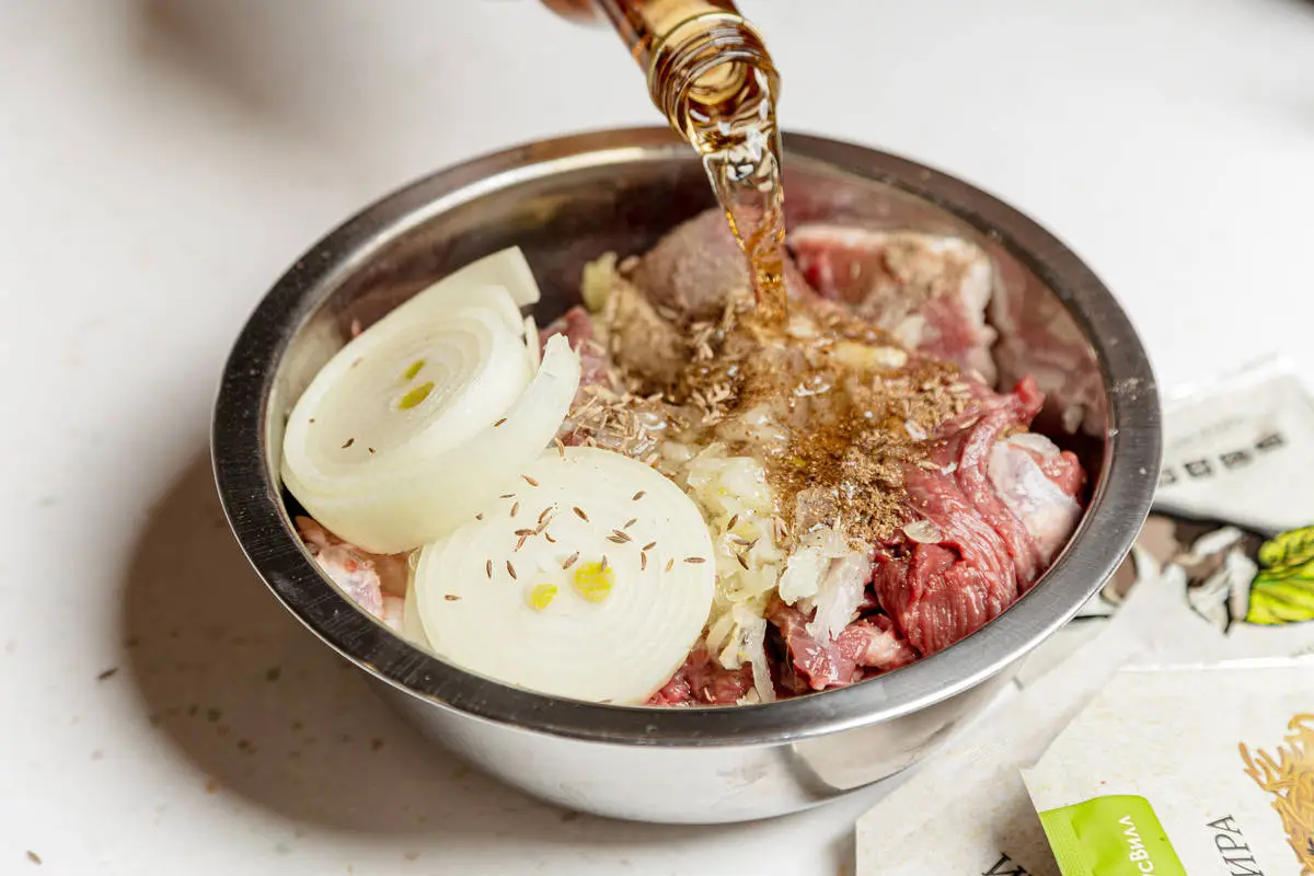 Лук очистите. Одну луковицу измельчите на крупной тёрке, а вторую нарежьте крупными кольцами, добавьте к мясу. Добавьте соль, специи и уксус.