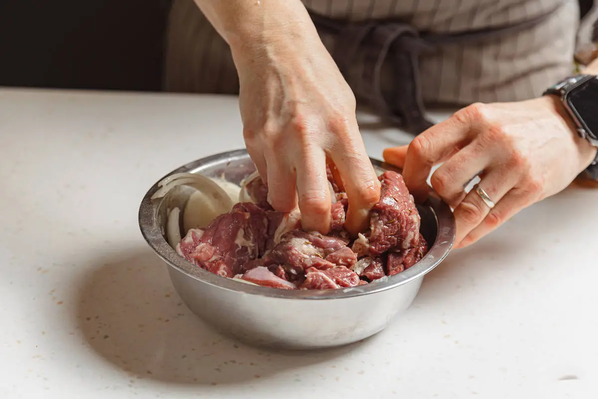 Помните мясо руками, чтобы оно дало сок и хорошо перемешалось. Оставьте мариноваться в прохладном месте на 2 часа.