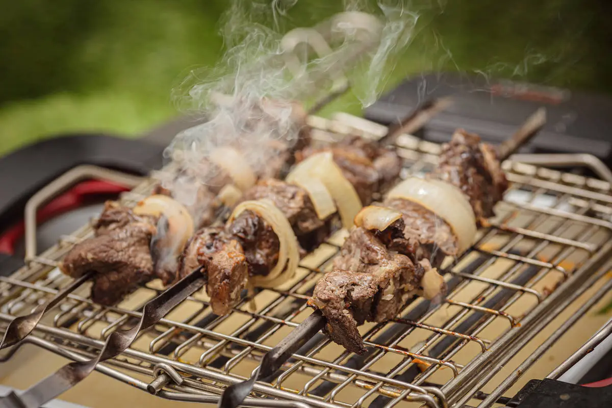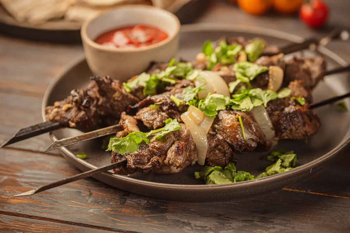 Подавайте шашлык горячим с томатным соусом и свежими овощами.