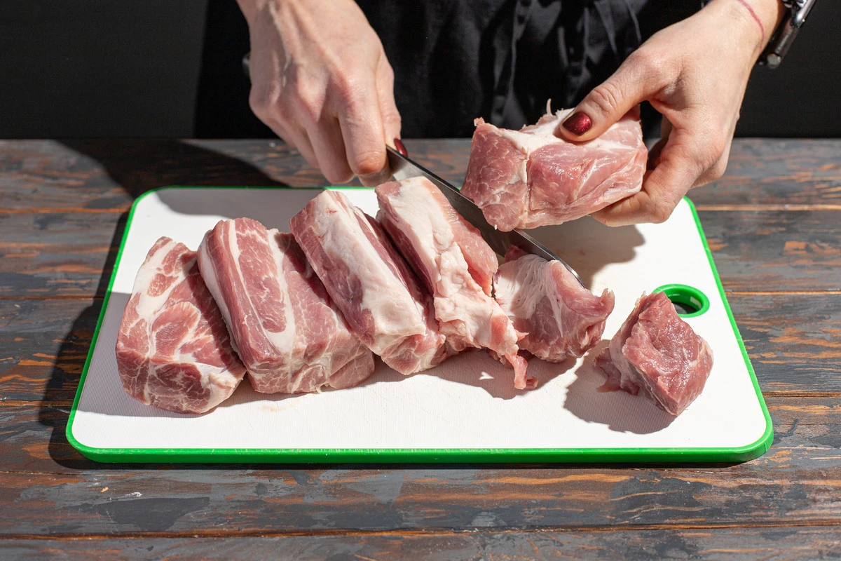 Свинину нарежьте кубиками среднего размера. Важно, чтобы куски были не слишком маленькими, иначе мясо пересохнет на огне, но и не слишком крупными, чтобы внутри мясо успело приготовиться.