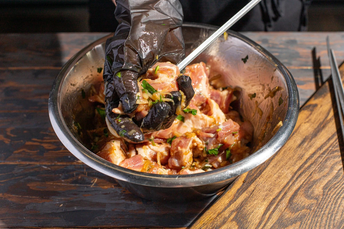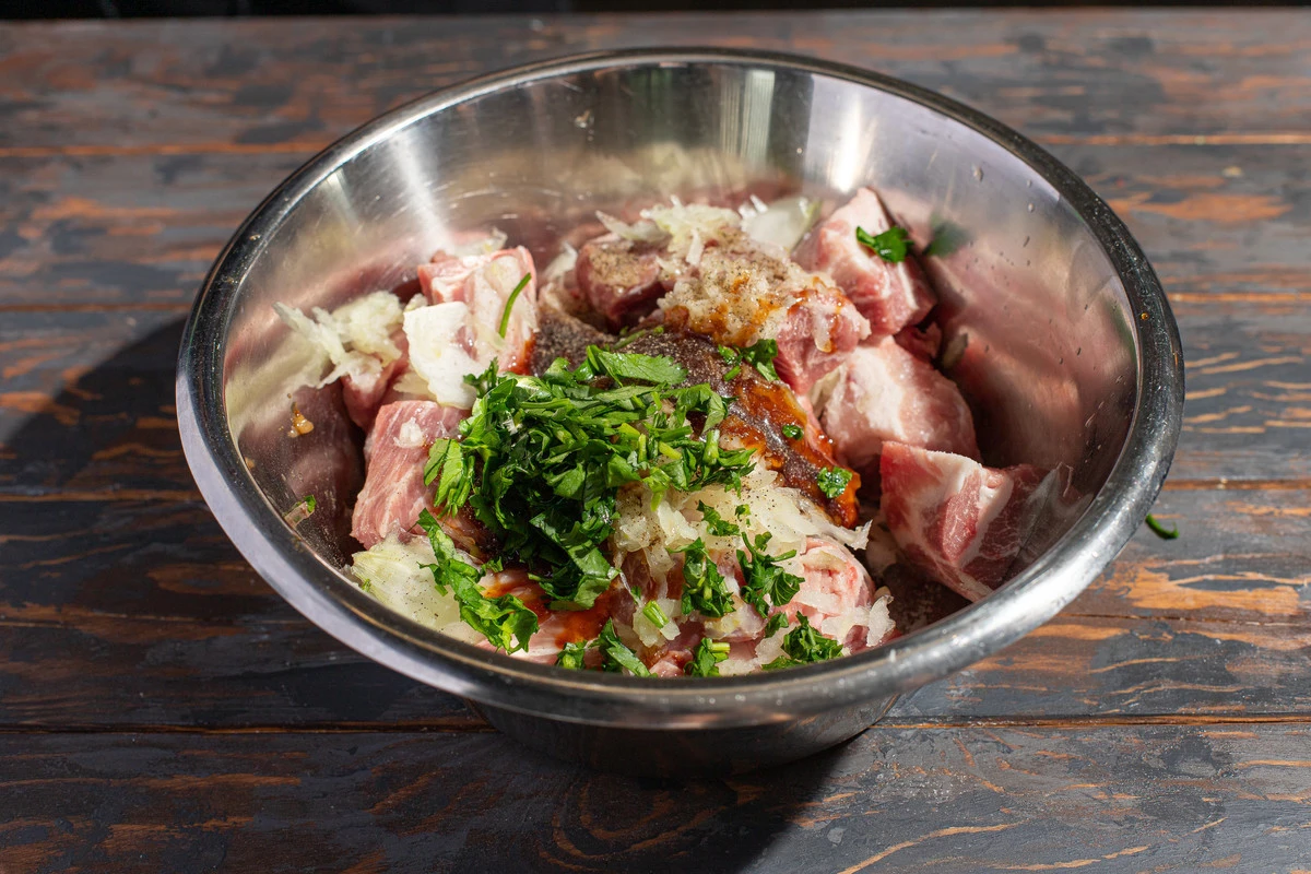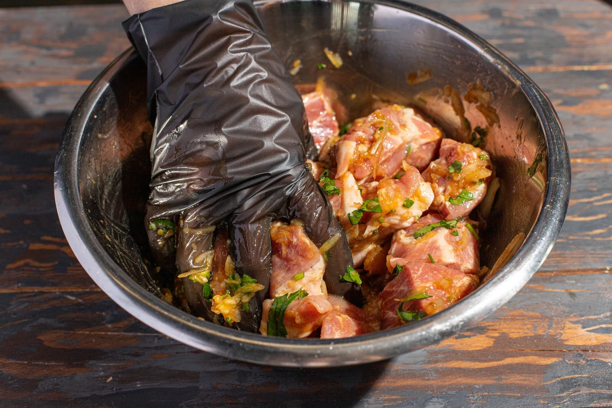 Маринад перемешайте с мясом руками, оставьте свинину в маринаде на 2-3 часа при комнатной температуре. Если планируете мариновать мясо дольше, уберите его в холодильник.