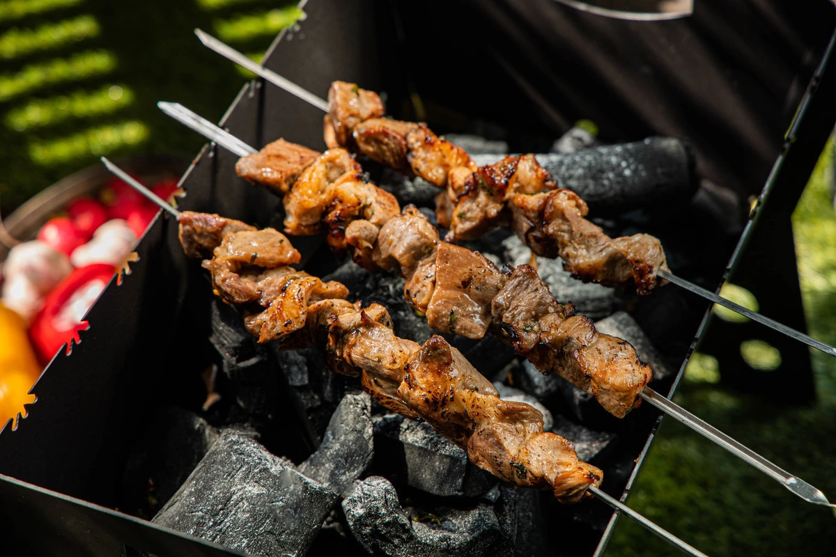 Жарьте шашлык над углями, периодически переворачивая. Не поливайте шашлык водой, просто убирайте шампуры, когда вспыхивает огонь, а затем возвращайте на место. Шашлык из свинины обязательно должен быть полностью прожарен, проверяйте мясо перед подачей.