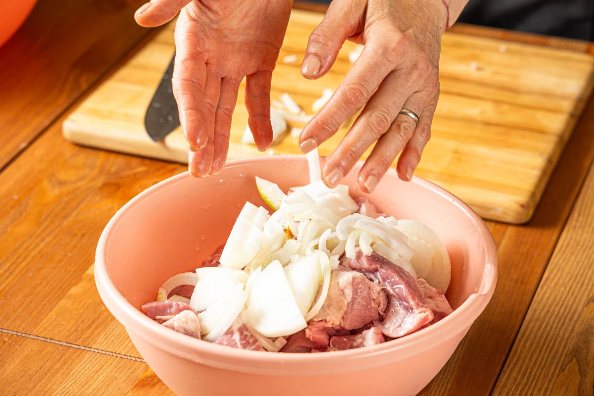Мясо нарежьте крупными кусками. Сложите в большую миску или кастрюлю.