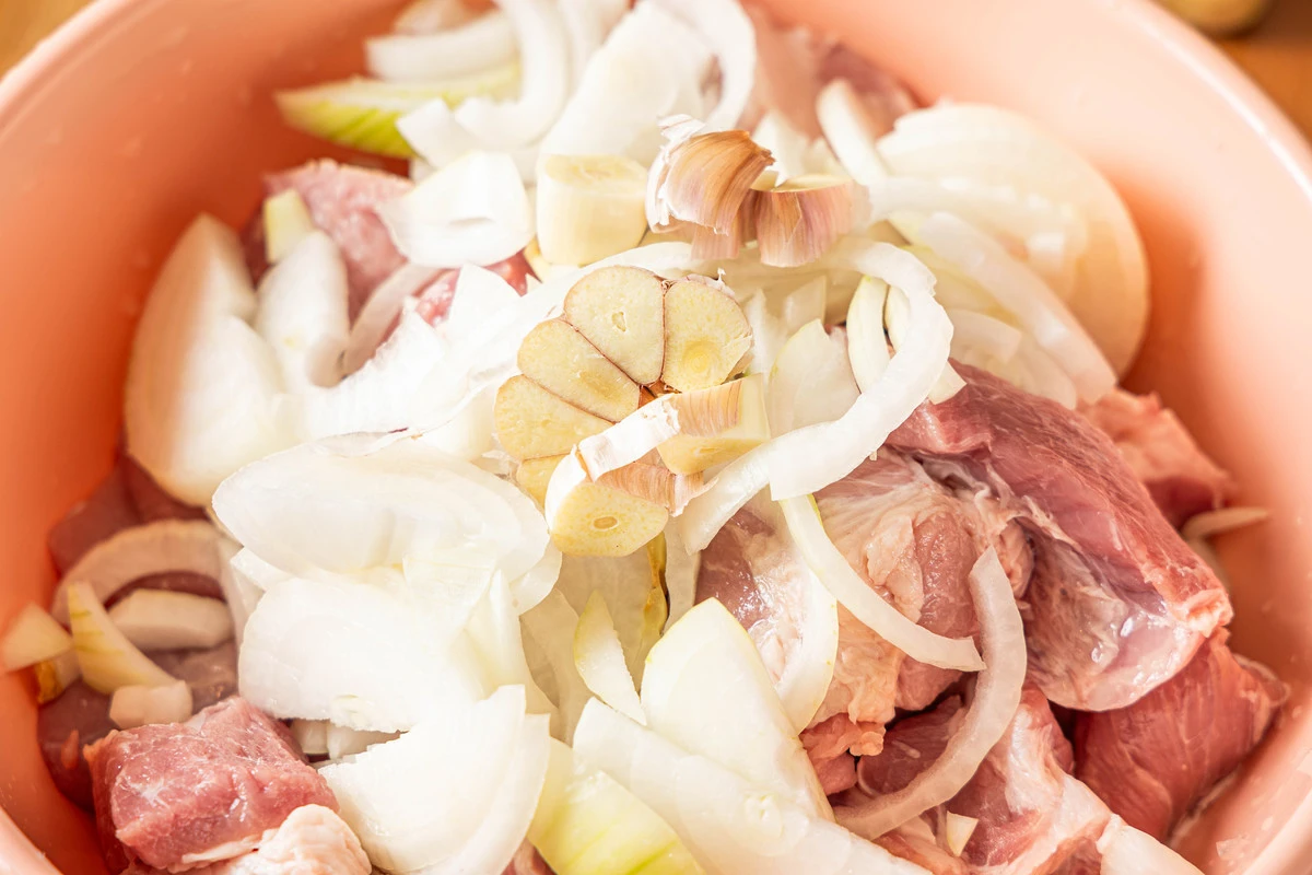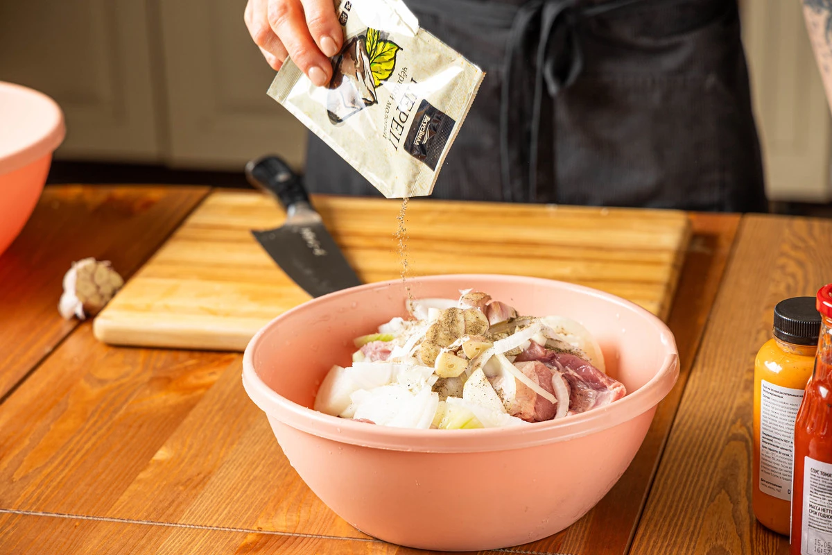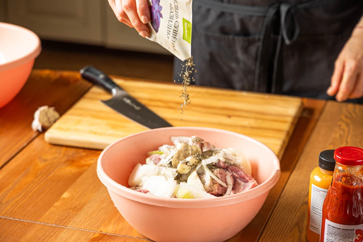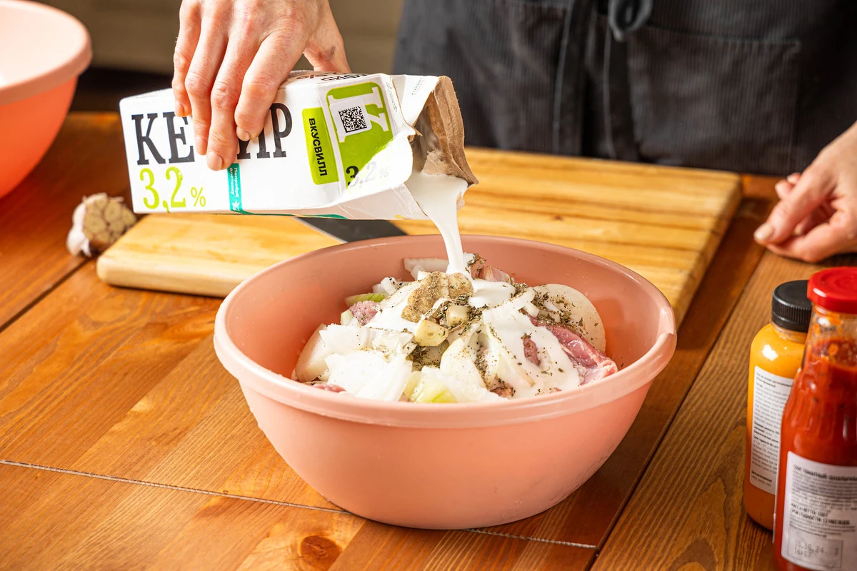 Довольно классический и популярный рецепт маринования шашлыка — на кефире. Чтобы сделать вкус поярче, мы добавили молотую паприку и сушёный базилик. Вы можете добавить и свои любимые специи, а также менять пропорции ингредиентов по вкусу.