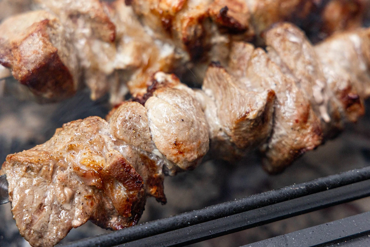 Нанижите мясо на шампуры и пожарьте до готовности.