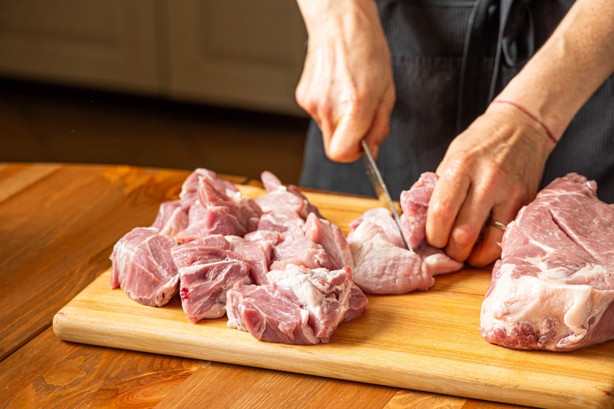 Мясо нарежьте крупными кусками. Сложите в большую миску или кастрюлю.