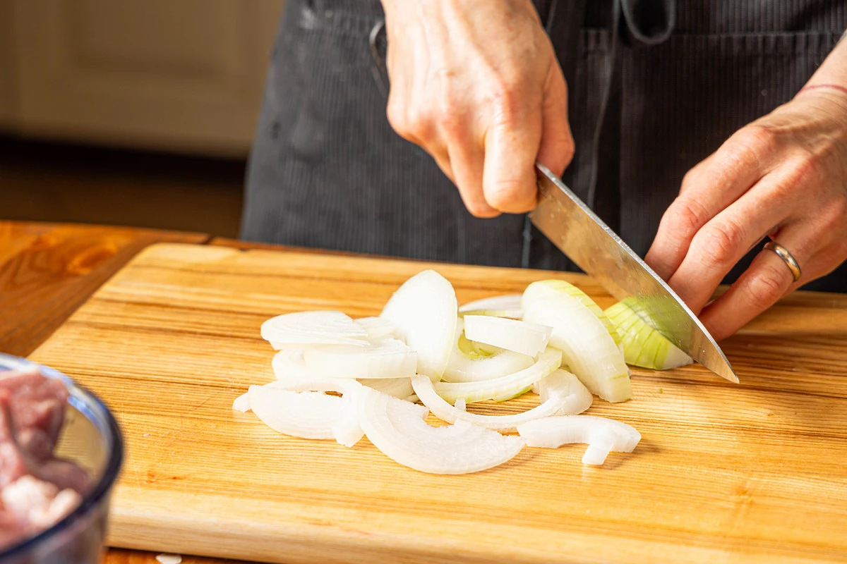 Лук почистите и нарежьте крупными кольцами. Добавьте к мясу.