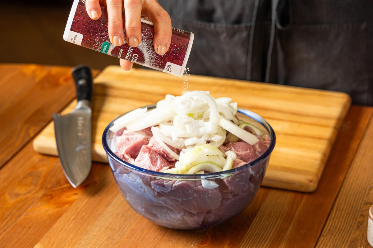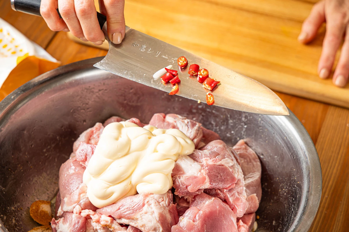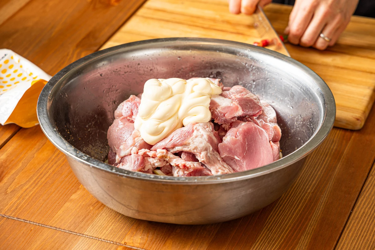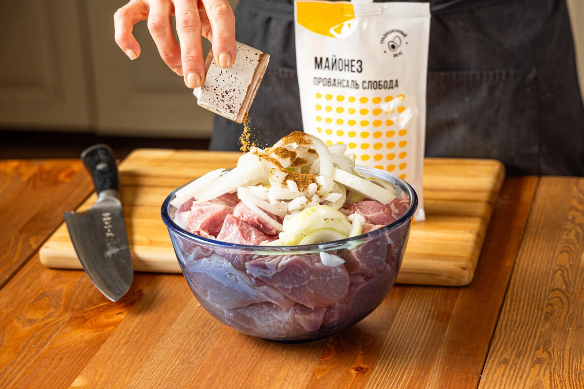 Ещё один распространённый вид маринада для мяса — с майонезом. Такой шашлык получится ещё сочнее и нежнее, румяным и аппетитным. Добавьте любимые специи и немного перца чили, чтобы усилить вкус.