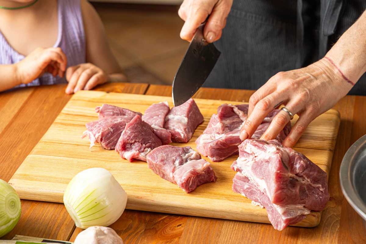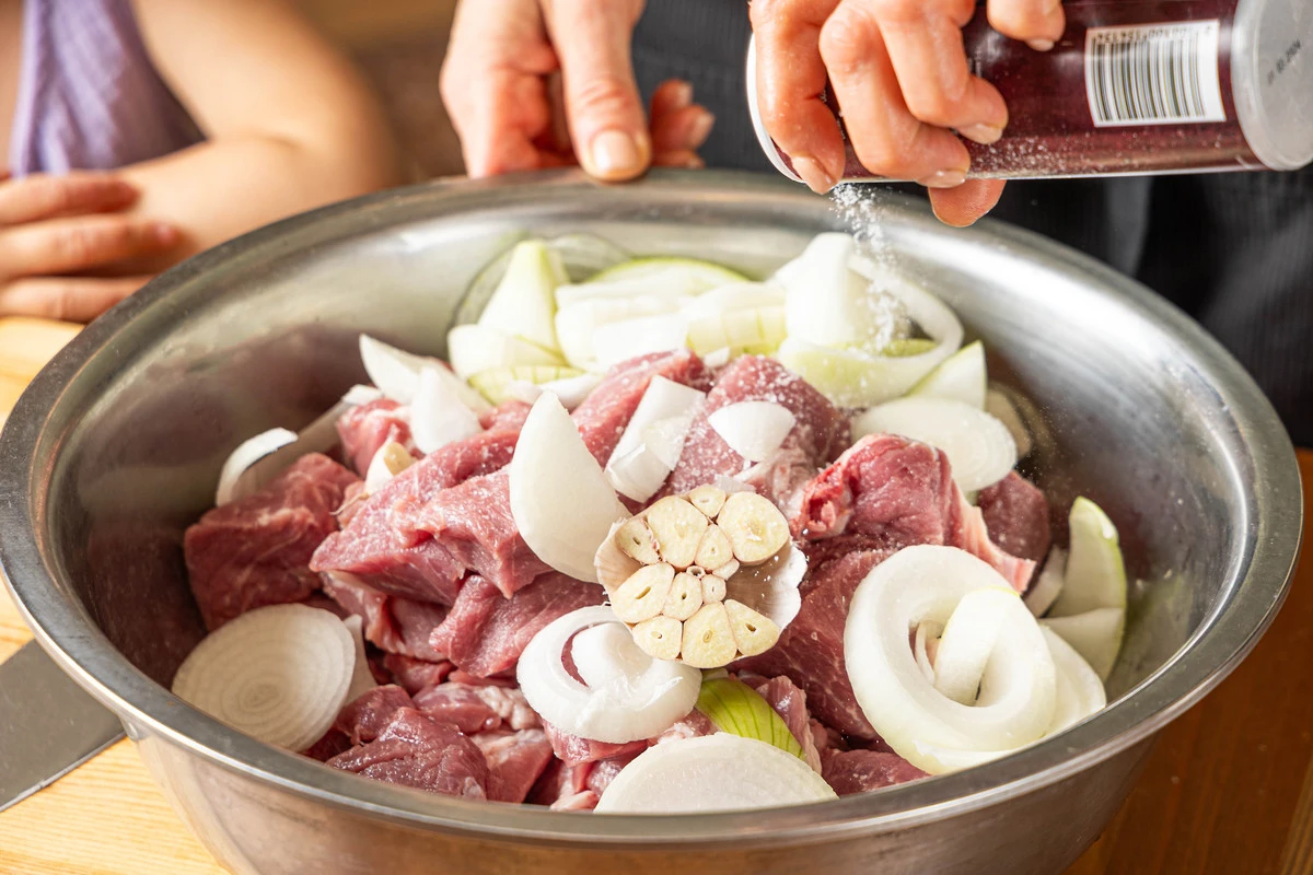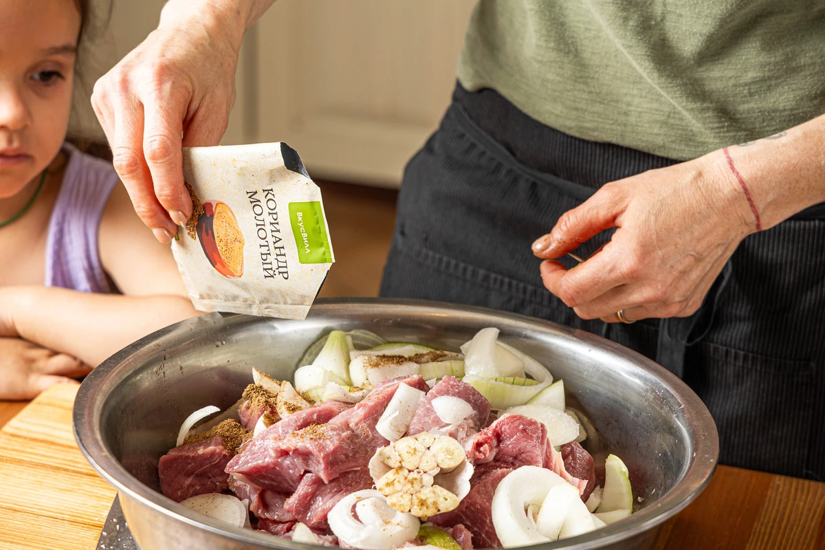 Мясо нарежьте крупными кусками. Сложите в большую миску или кастрюлю.