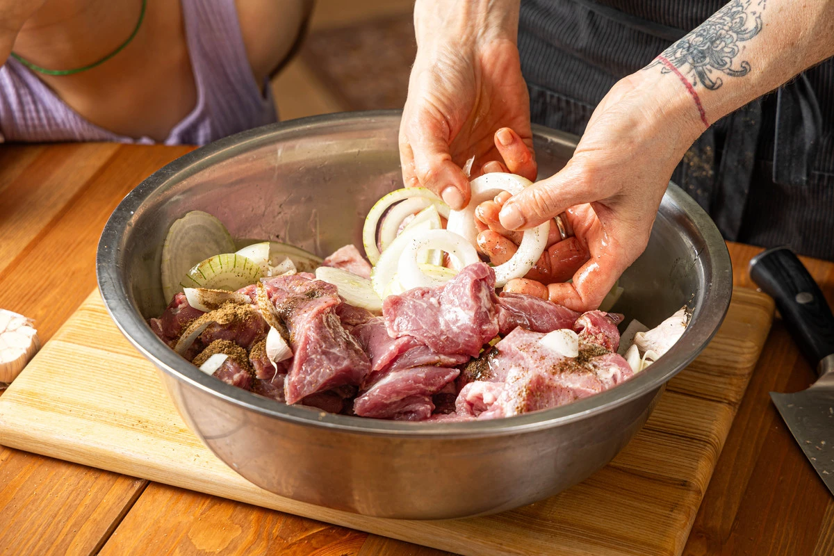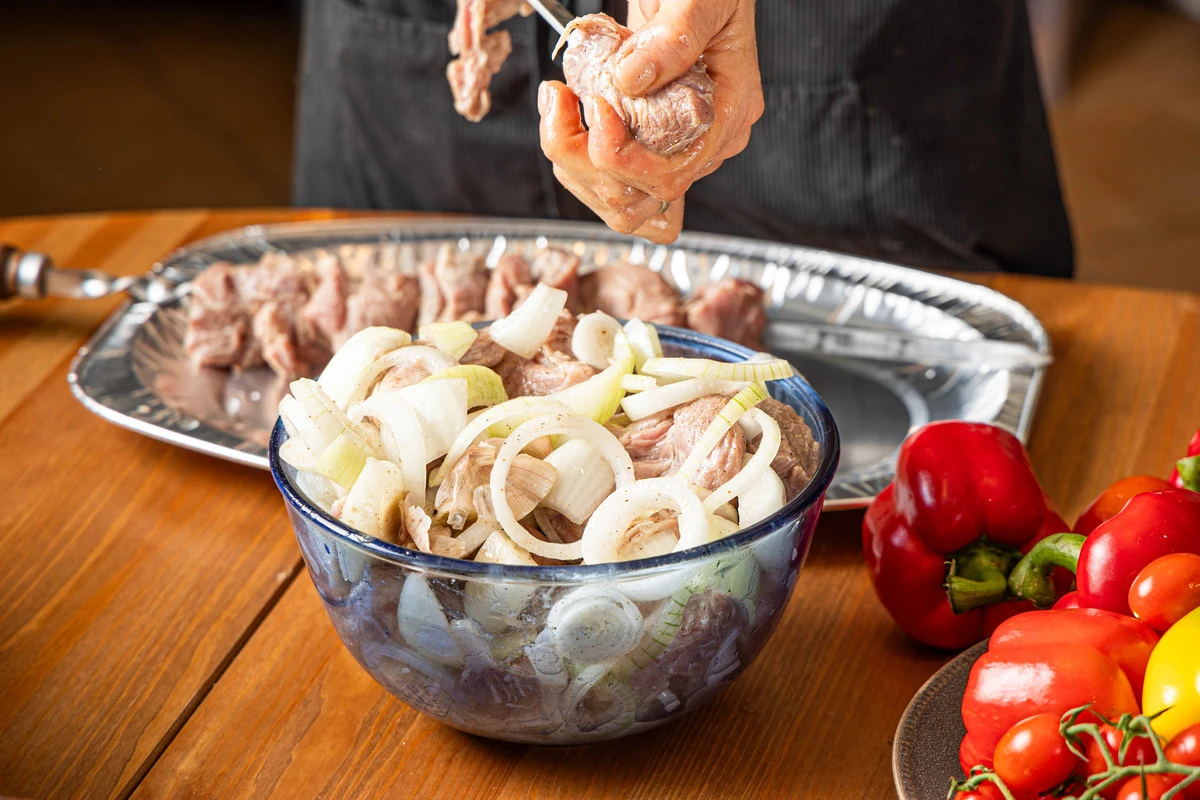 Классический и любимый многими шашлык, замаринованный с уксусом. Такой маринад стал популярным, так как уксус может спасти чуть полежавшее мясо. Но мы всё же рекомендуем готовить из свежего, а уксус добавить просто для вкуса.