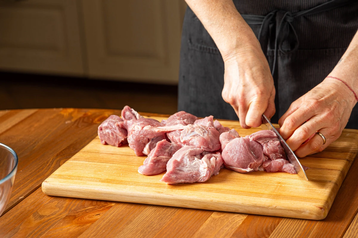 Мясо нарежьте крупными кусками. Сложите в большую миску или кастрюлю.