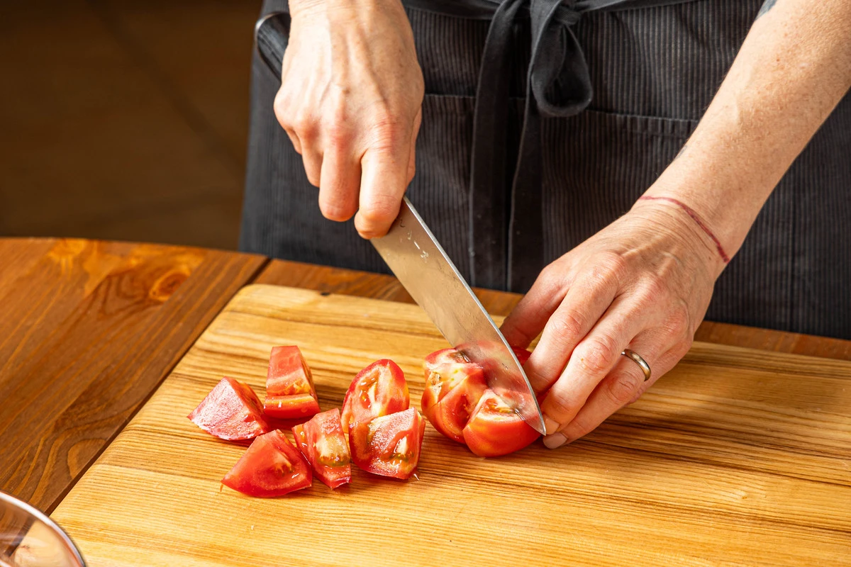 Помидор нарежьте крупными кусочками и добавьте к мясу.