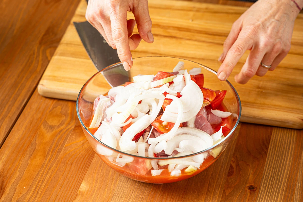 Лук почистите и нарежьте крупными кольцами. Добавьте к мясу.