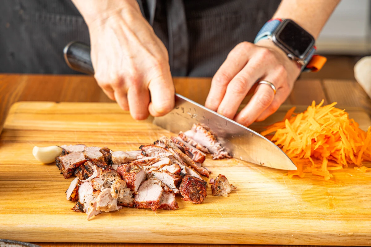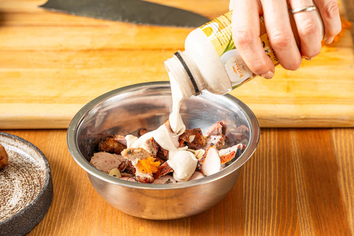 Добавьте в миску с мясом 1 ст. л. соуса и перемешайте.