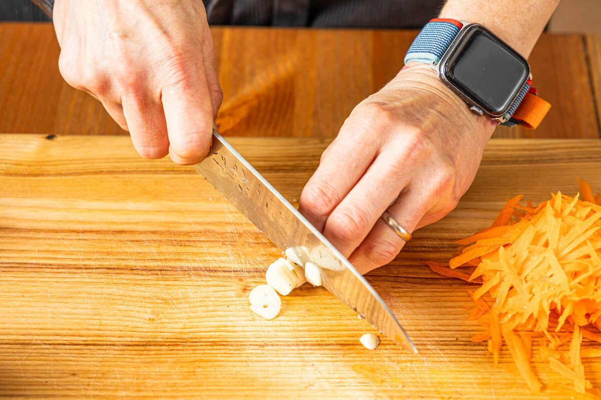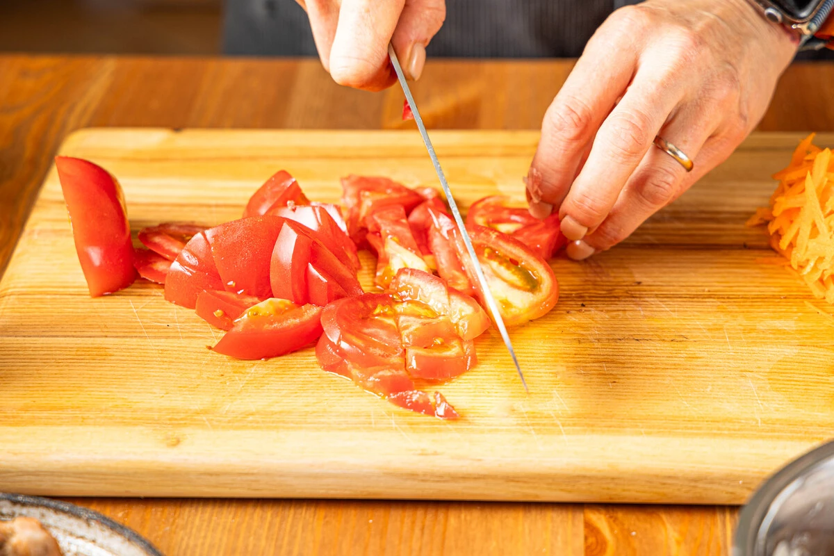 У помидора вырежьте плодоножку, мякоть нарежьте кусочками.