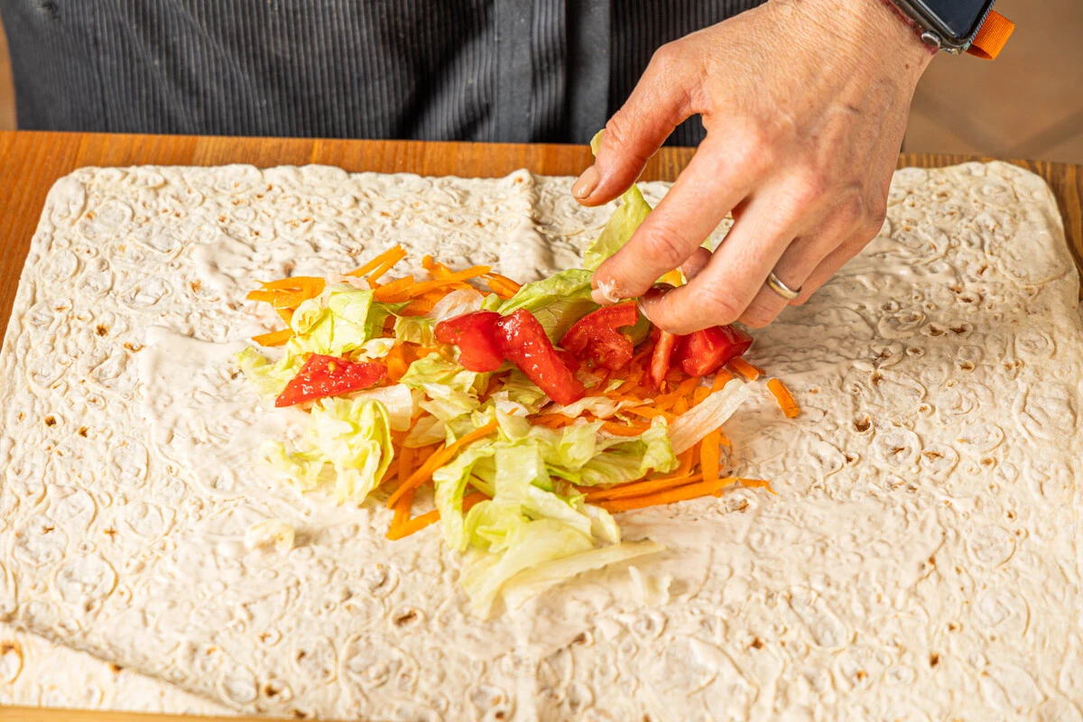 Смажьте каждый лаваш 1–2 ст. л. соуса, выложите на каждый по половине овощей и мяса.