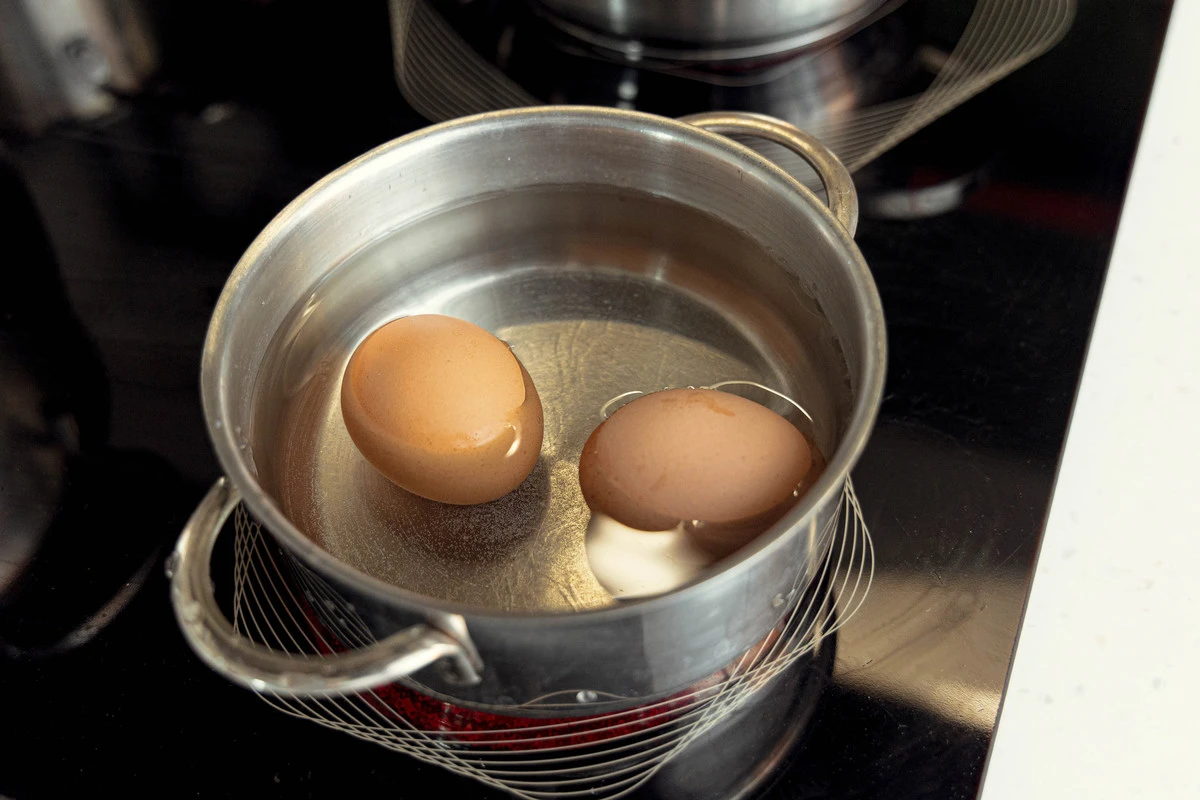 Яйца сварите вкрутую, переложите в холодную воду остывать.
