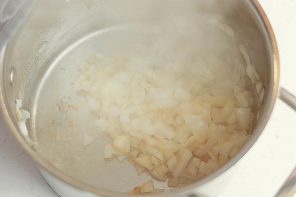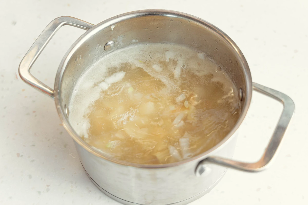 Прямо в кастрюле обжарьте лук с чесноком на растительном масле до прозрачности, затем влейте примерно 1 литр воды.